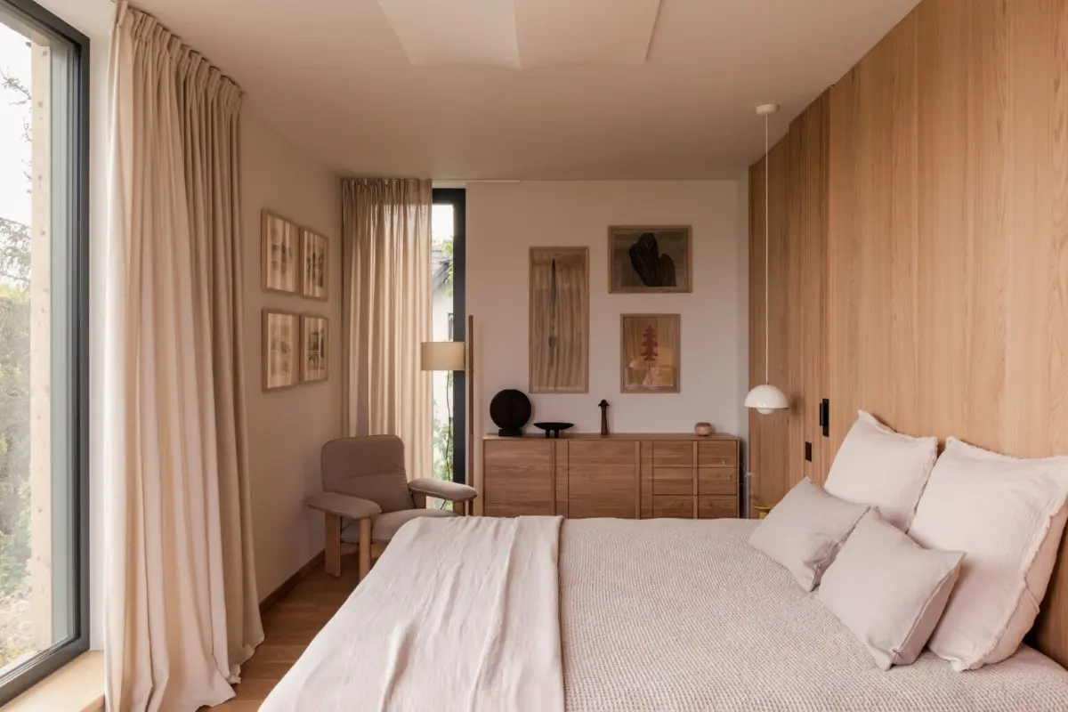 Projekt luksusowego domu zachwyca przemyślaną aranżacją, w której każdy detal ma znaczenie. Pomimo minimalistycznej estetyki panuje tu przytulna atmosfera, którą zawdzięczamy dużej ilości najwyższej jakości tkanin oraz wszechobecnego drewna.