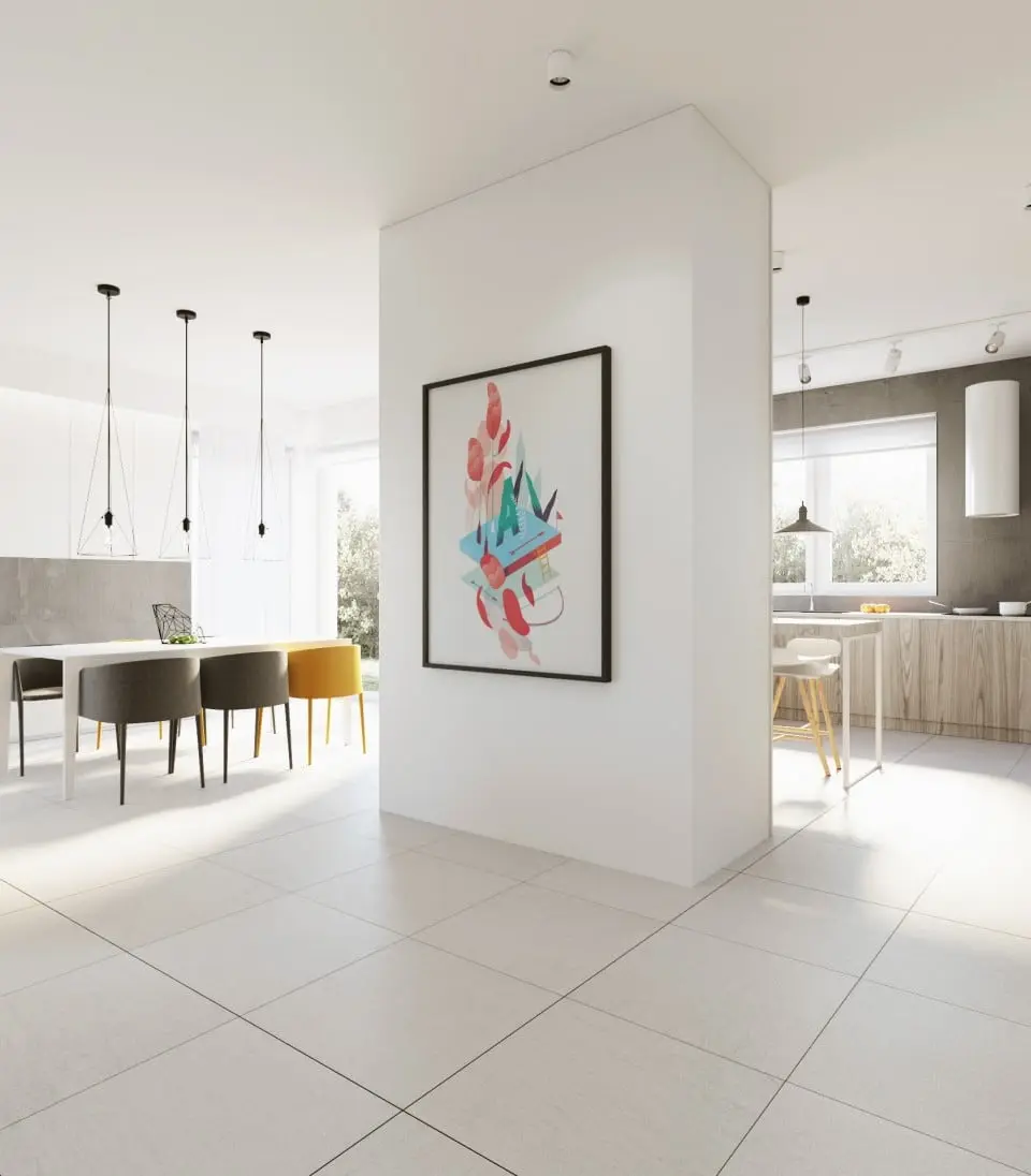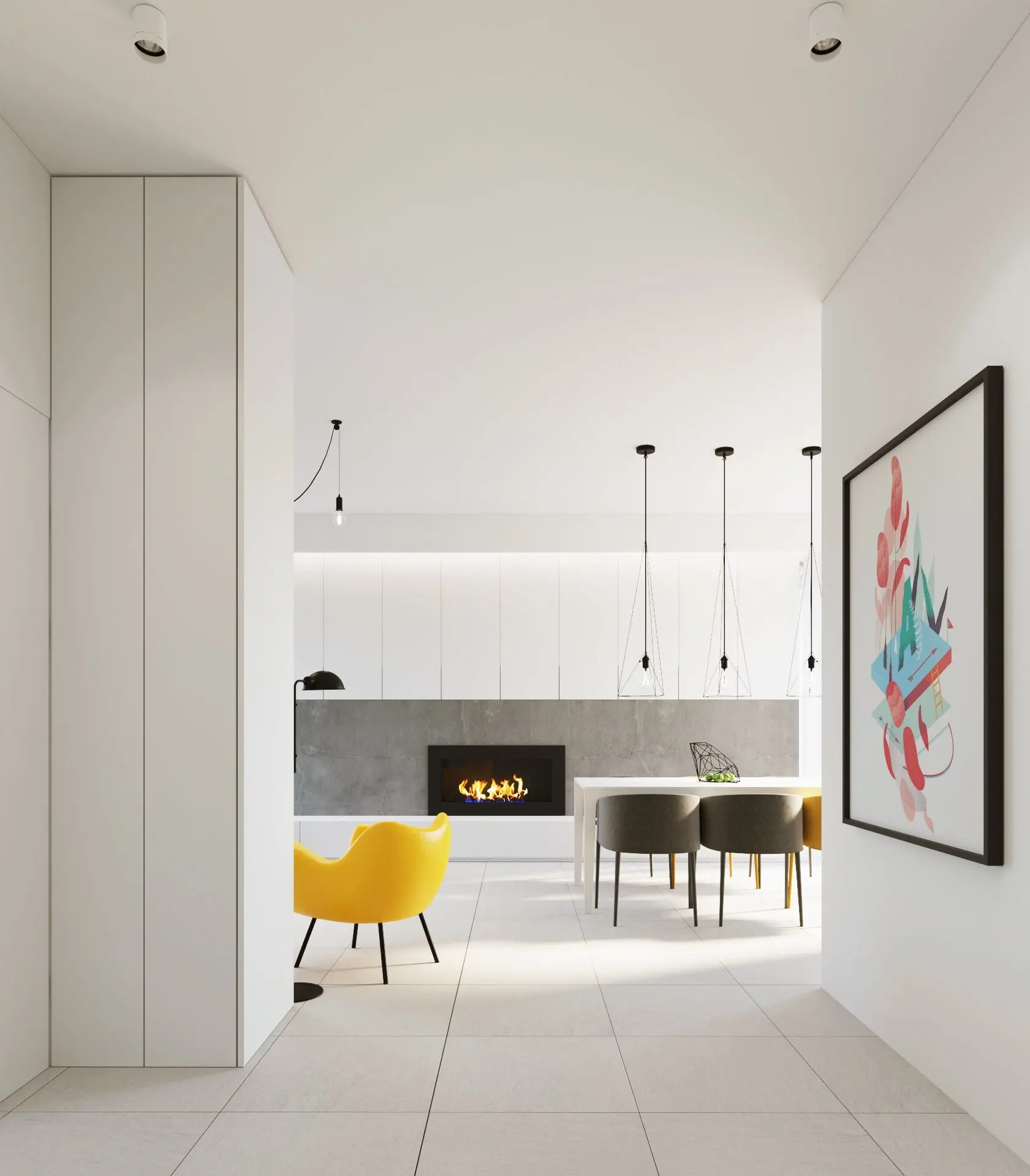 Dom dla 4-osobowej rodziny w Lublinie projektu pracowni 081 Architekci. Znakiem rozpoznawczym biura jest styl minimalistyczny, a także stosowanie mocnych, ale jednolitych akcentów kolorystycznych. Tak jak w tym przypadku, najczęściej jest to żółć. Poza tym, we wnętrzu dominują biel i szarość, które są charakterystyczne właśnie dla minimalizmu. Mimo, że ten styl kojarzy się z zimnem i surowością, to zastosowanie faktury drewna, jasnych barw i ciepłego akcentu kolorystycznego sprawia, że wnętrze jest przestrzenne i ciepłe. Dodatkowo, oryginalnego charakteru nadają meble o ciekawym nowoczesnym wzornictwie, designerskie dodatki oraz ożywiające przestrzeń grafiki Michała Bednarskiego.