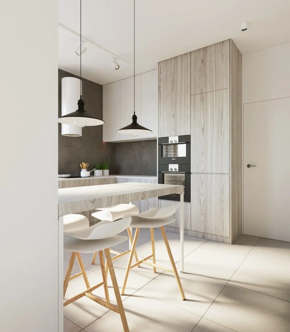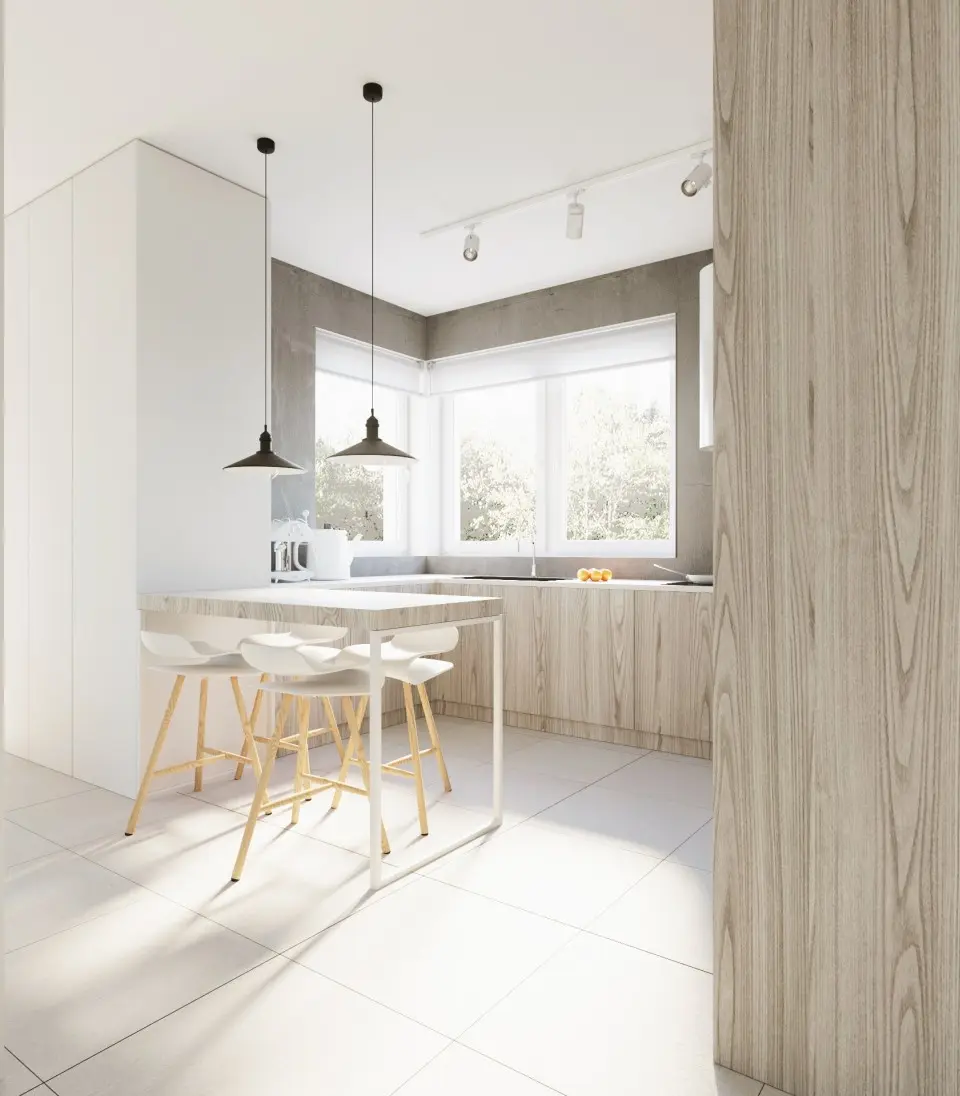Kuchnia to jedyne pomieszczenie odróżniające się od reszty pomieszczeń. Cała zabudowa kuchenna wykonana jest z fornirowanej płyty z kamiennym blatem z białego kwarcytu. W centralnej części pomieszczenia umieszczono barek z hokerami przeznaczony do jedzenia śniadań.