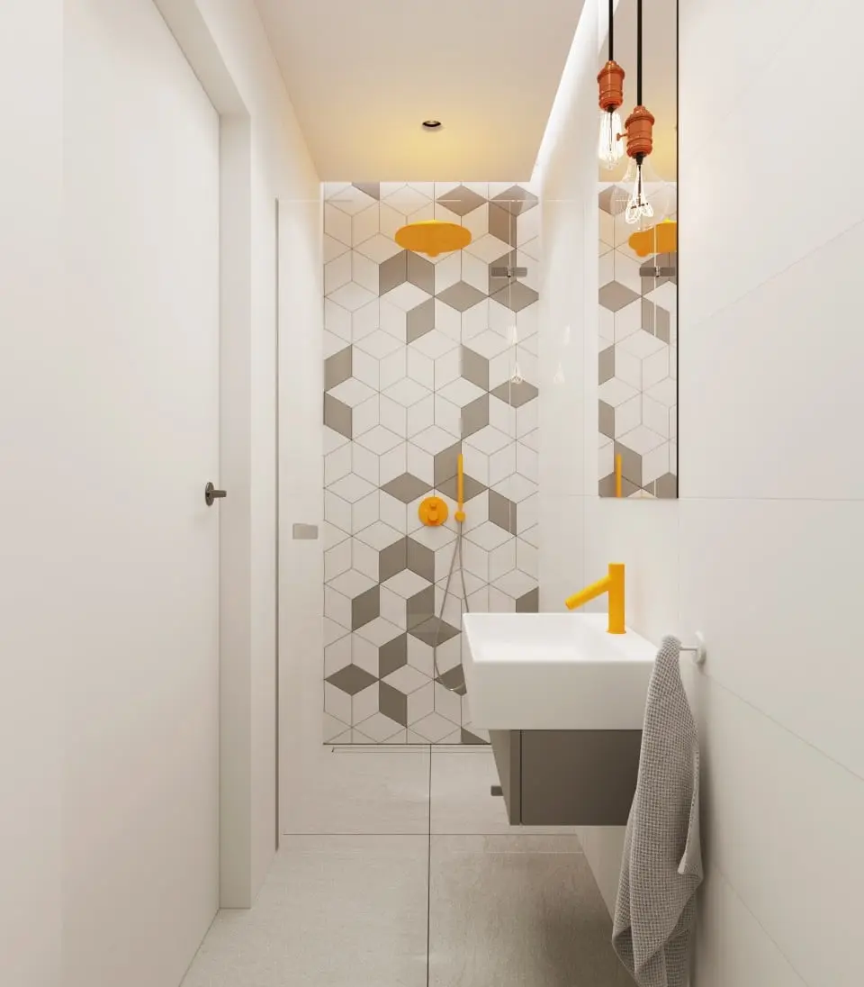 Podłoga w łazience na parterze, tak jak i pozostałych pomieszczeń, wykonana jest w szarej płytce. Ściany pokryte są białą płytką, natomiast oryginalnego charakteru wnętrzu nadaje oryginalna płytka o geometrycznym kształcie rombów.