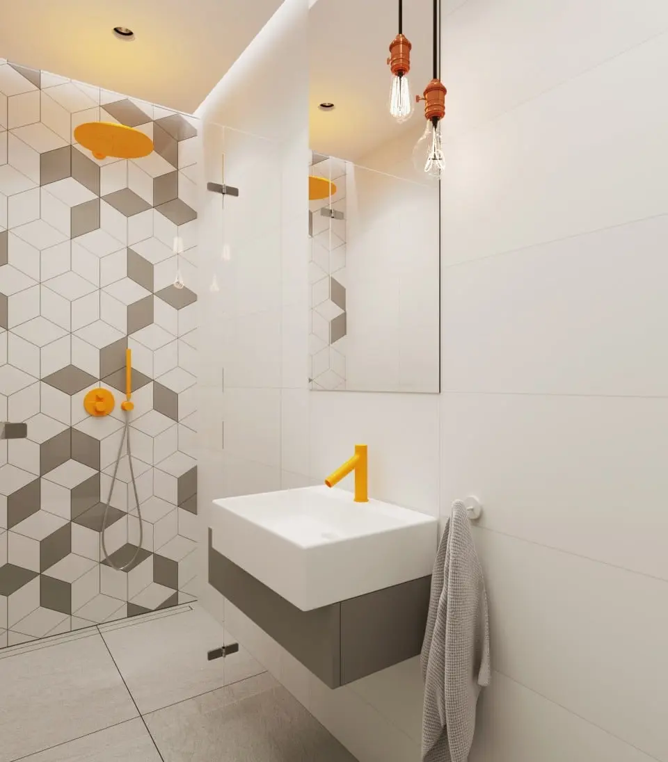 Wszystkie baterie oraz ozdobne oświetlenie przy umywalce zaprojektowano w kolorze pomarańczowym.