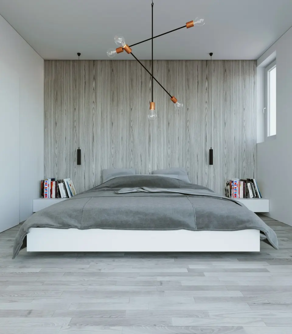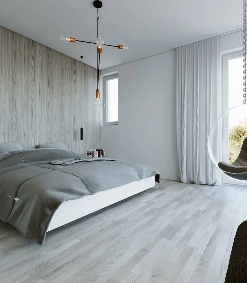 Podłoga sypialni jest drewniana, a ścianę za łóżkiem pokryto płytą fornirowaną. Przed łóżkiem umieszczono podwieszany do sufitu fotel oraz toaletkę z lustrem.