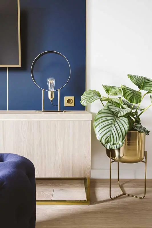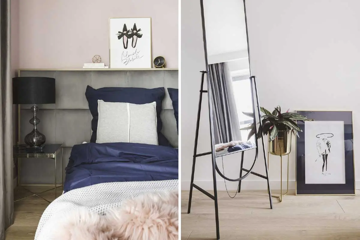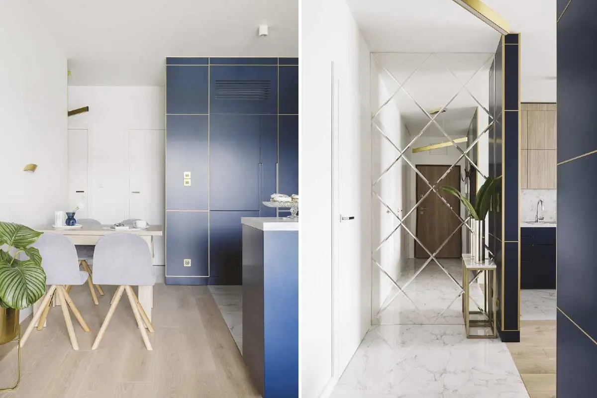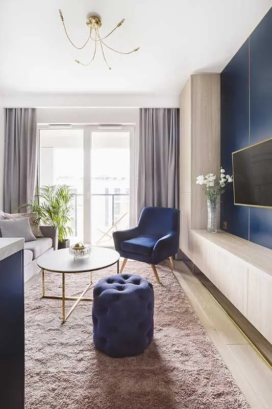 Inwestorka na pierwszym spotkaniu, precyzyjnie określiła wymagania co do aranżacji. Miał dominować granat, pudrowy róż i akcenty złota. Architektka od razu poczuła klimat, jaki marzy się właścicielce mieszkania i zaproponowała złagodzoną wersję stylu glamour. Mieszkanie o powierzchni 47 m2, posiada bardzo klasyczny układ, podzielony na strefę dzienną, sypialnię oraz łazienkę. Dominantę barwną stanowi granat w odcieniu navy blue, który pokrywa większość powierzchni. Paletę barwną uzupełnia pudrowy róż i ciepła szarość. Ciekawym rozwiązanie jest zastosowanie ścianki działowej, dzięki której udało się wydzielić hol.