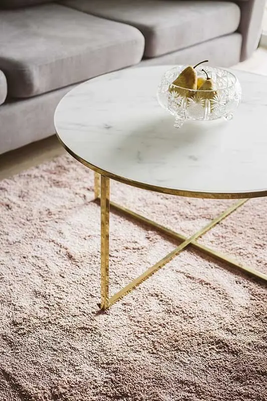 Bardzo ważną rolę w aranżacji wnętrza odegrały zastosowane materiały. Właśnie dzięki nim udało się stworzyć subtelny glomour. Oczywiście nie mogło się obyć bez znamiennego dla tego stylu marmuru. Architektka zestawiła go z drewnem, co mogłoby wydawać się ryzykowne, ale w tym wypadku ociepliło wnętrze. Do pary dołączył welur, który idealnie dopełnia stylizację. Tkanina występuje na tapicerkach mebli, poduchach oraz zasłonach. Miękki dywan w kolorze pudrowego różu wprowadza faktor przytulności. Zgrane trio materiałowe wspomagają akcenty złota. Pojawiają się w podstawach mebli oraz oryginalnych „fugach” pomiędzy granatowymi powierzchniami.