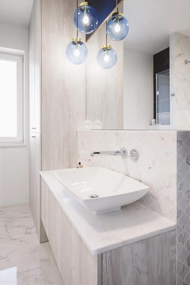 Łazienka mieszkania zaaranżowana jest w minimalistyczny sposób. Marmur zestawiony z jasnym drewnem, tworzy jednolite powierzchnie, optycznie powiększające wnętrze. Przestrzony prysznic typu „walk in” wydzielony jest transparentną szybą, co potęguję wrażenie otwartości. Całość dopełnia chromowana armatura, która nadaje pomieszczeniu elegancji. Powstała tu, swojego rodzaju, ekskluzywna strefa domowego SPA.
