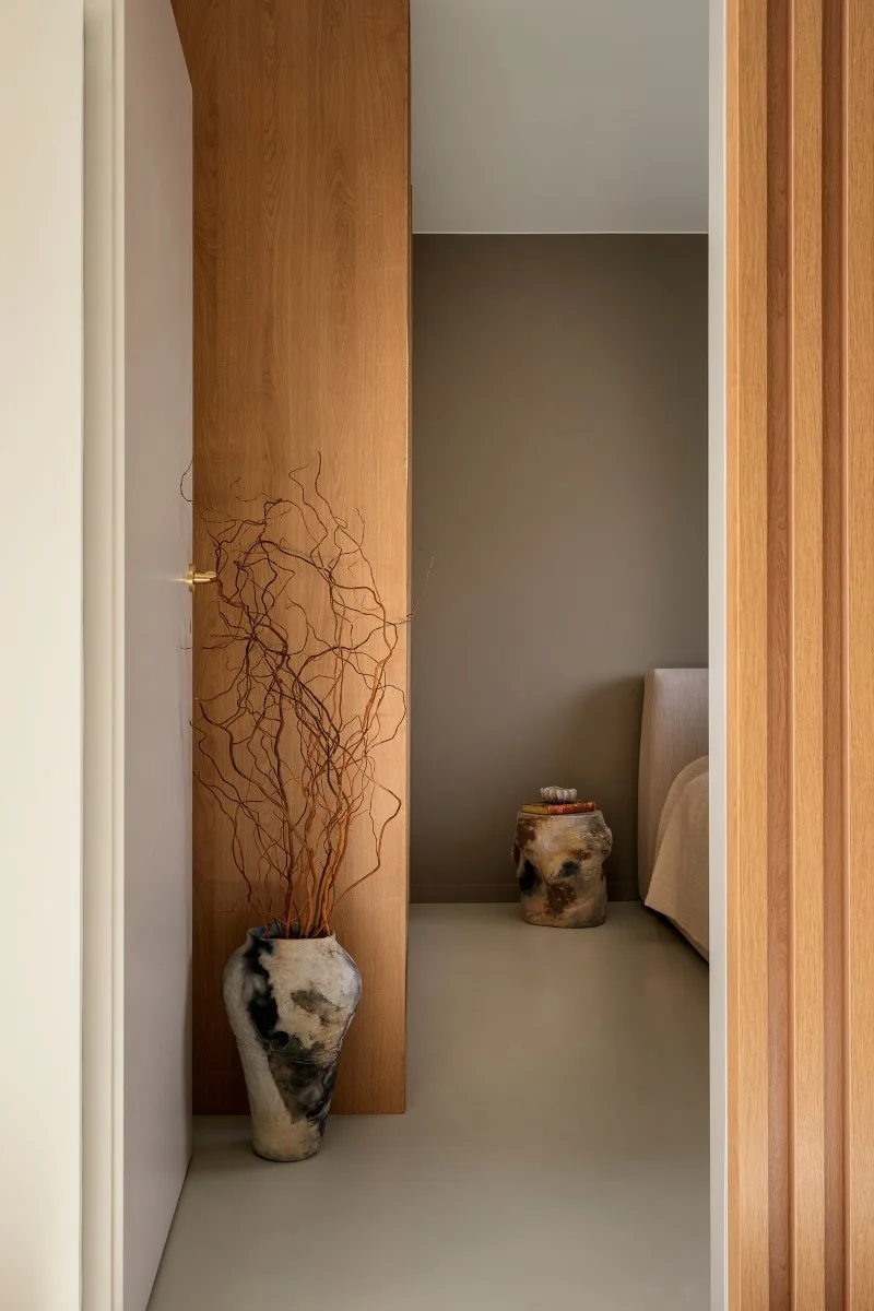 Stonowaną bazę wnętrza przełamują nieco mocniejsze, choć wciąż zgaszone kolory, pozostające w duchu wabi-sabi. Są to odcienie zieleni pojawiające się na zabudowie kuchennej oraz w łazience w formie kafli. Ciekawym elementem aranżacji jest także czekoladowy brąz zastosowany w sypialni, który doskonale komponuje się z naturalnym klimatem domu.