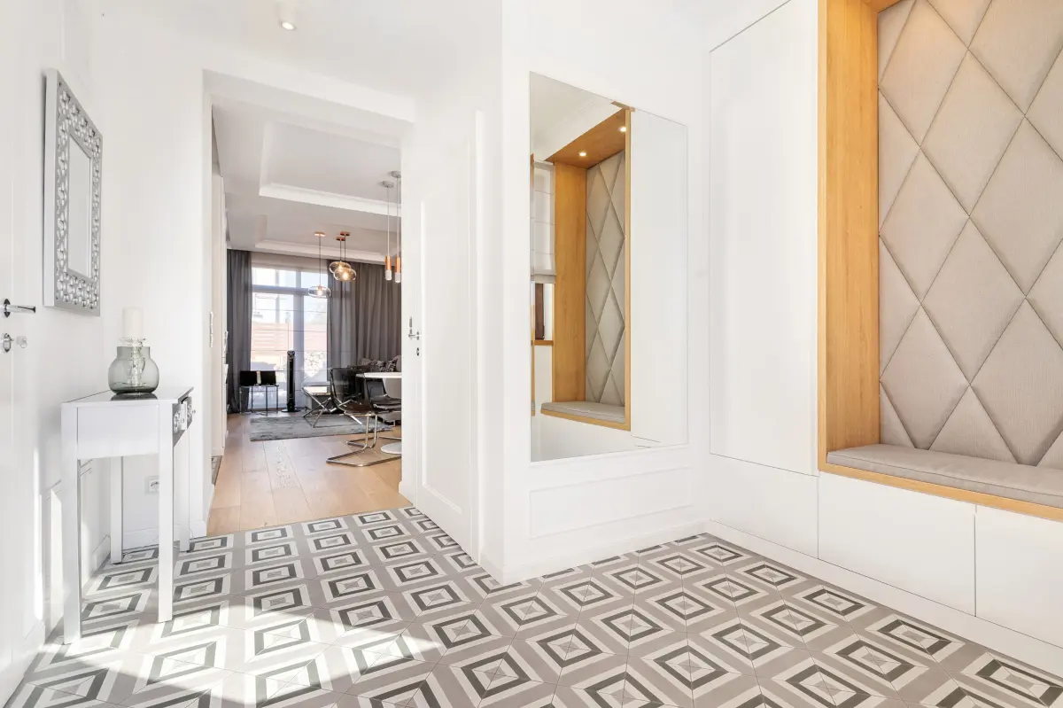 Wejście do domu znajduje się od południa. W związku z tym architekci zdecydowali się wyburzyć ścianę dzielącą wiatrołap i salon. Dzięki temu zabiegowi wnętrze jest bardziej doświetlone a cała przestrzeń optycznie zyskała na wielkości. Dodatkowo na podłodze w przedpokoju, łazience i kuchni płytki mają ten sam wzór, co ujednolica tę niedużą przestrzeń, jednocześnie nadając jej indywidualny charakter. Pozostała część podłóg jest pokryta warstwowymi deskami w kolorze naturalnego dębu. Ciepły kolor drewna w połączeniu z szarością, czernią i bielą, sprawia że projekt jest pełen przytulności.