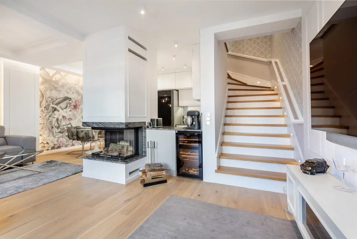 Centralne miejsce parteru zajmuje trójstronny kominek. Przytulny i zarazem elegancki charakter wnętrza podkreślają zastosowane w projekcie wysokiej jakości materiały. Kamienne blaty, hiszpańskie płytki, dębowe podłogi i schody oraz meble robione na indywidualne zamówienie – te wszystkie elementy tworzą niepowtarzalną aurę projektu a także są gwarantem ponadczasowego i nieulegającemu wpływowi zmiennych trendów piękna.