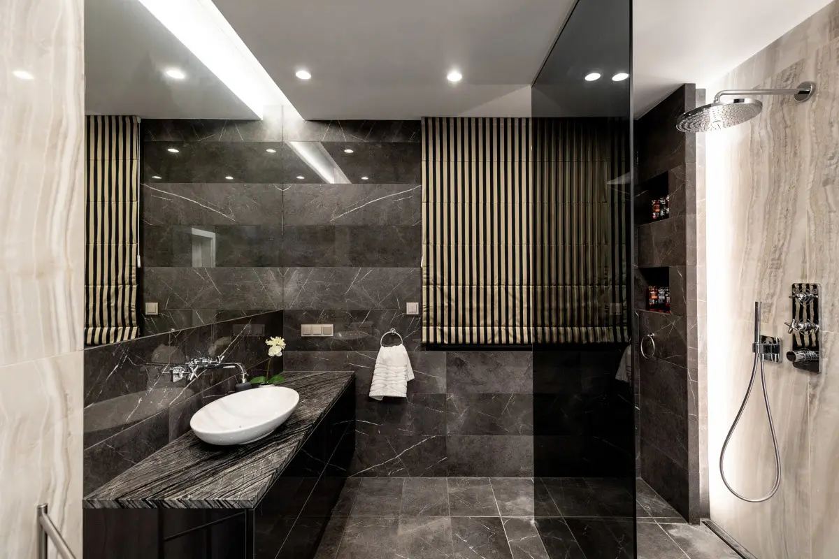 Lekkości i zarazem wyrafinowania wnętrzu dodają wielkoformatowe płytki w jasnym odcieniu. Ciekawym rozwiązaniem jest całkowicie otwarty prysznic ze szklaną ścianką subtelnie wyznaczającą strefę kąpielową. Szkło barwione na czarno nadaje łazience luksusowy charakter a pasiasta roleta i kamień na blacie dopełniają aranżację.