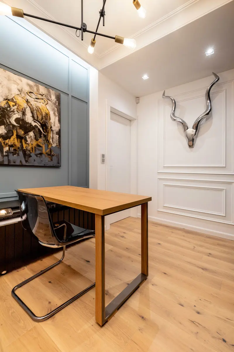 Stonowane kolory we wnętrzu kontrastują z malarstwem współczesnym Krzysztofa Cichonia, dopełniając i podkreślając charakter wnętrza. Znajdujący się na piętrze gabinet pana domu jest zaprojektowany z myślą o obrazie artysty. Srebrne poroże kontrastuje z dziełem, a turkusowa ściana z podziałami współgra z formą dzieła.