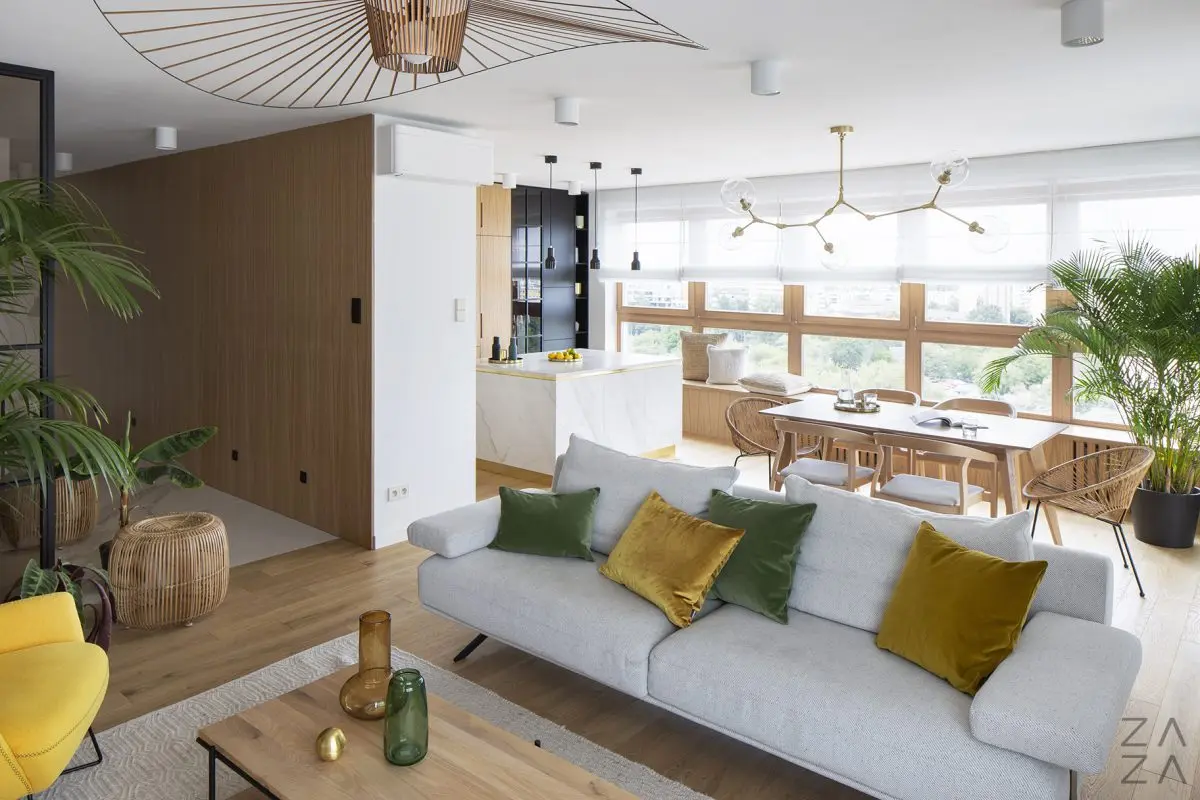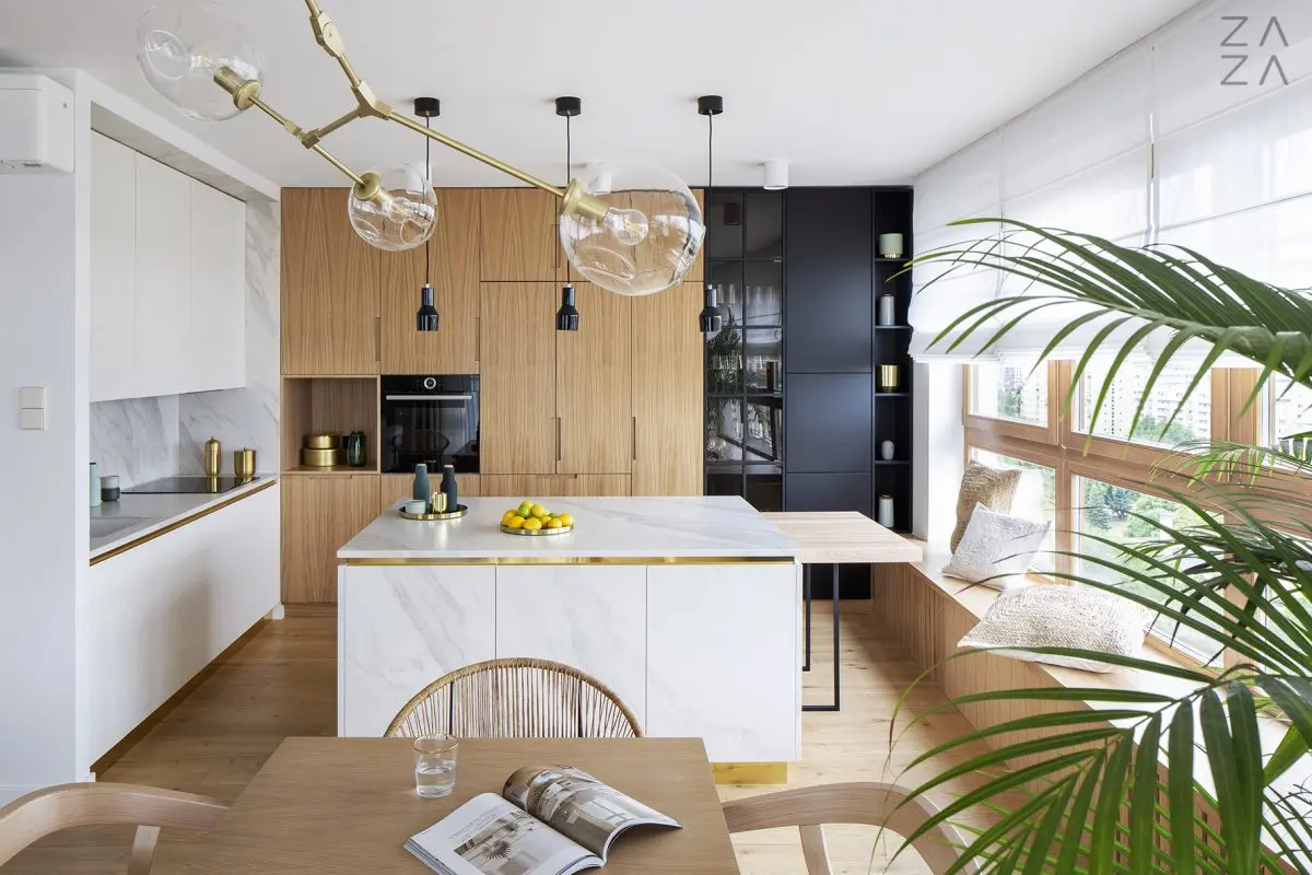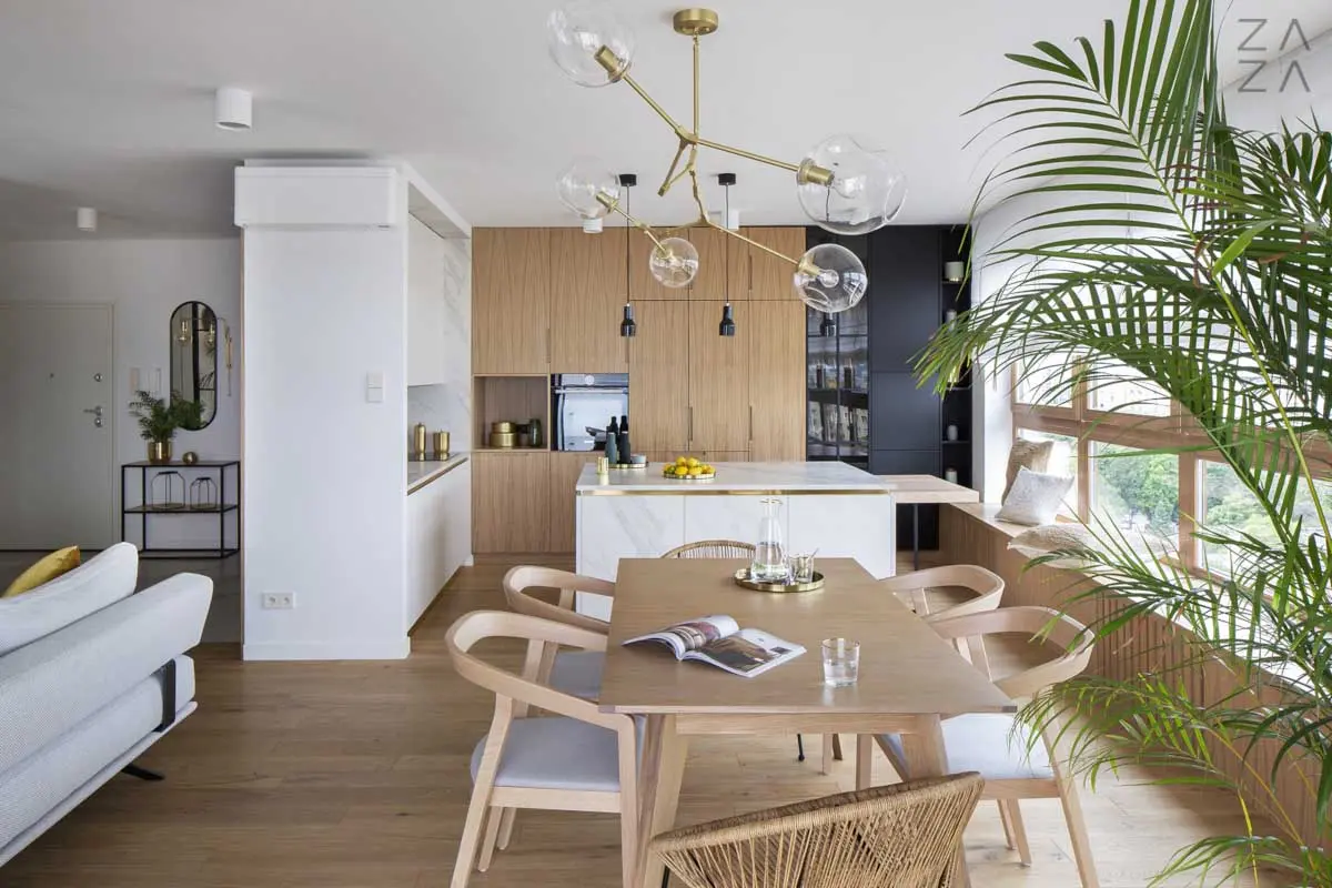 Przykładem takiego podejścia do projektowania jest najnowsza realizacja architektów z ZAZA studio. Ich klientem był bardzo wymagający, ale i świadomy inwestor. Głównym założeniem było stworzenie miejsca łączącego w sobie elementy luksusowego apartamentu i ciepłego, rodzinnego gniazdka. Projekt zakładał wykorzystanie naturalnych materiałów, takich jak drewno, mosiądz i kamień (architekci zdecydowali się na spieki kwarcowe, które są bardziej odporne).