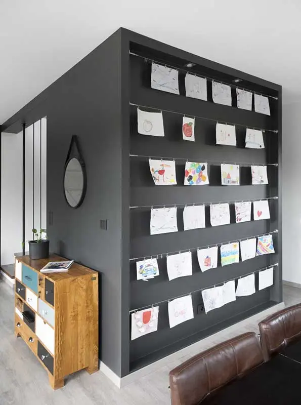 Jadalnia widoczna jest z salonu, jednak kuchnia została ukryta za ścianką, która pełni również funkcję, bardzo oryginalnej, domowej galerii.