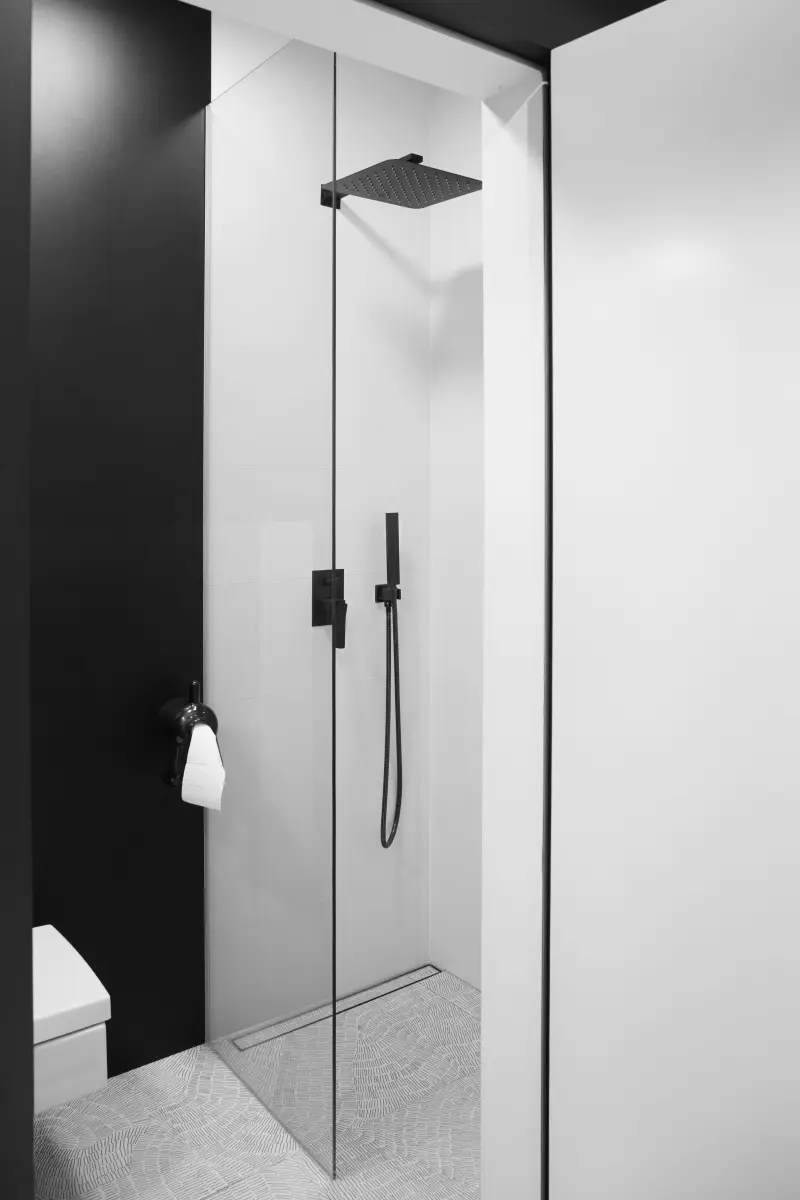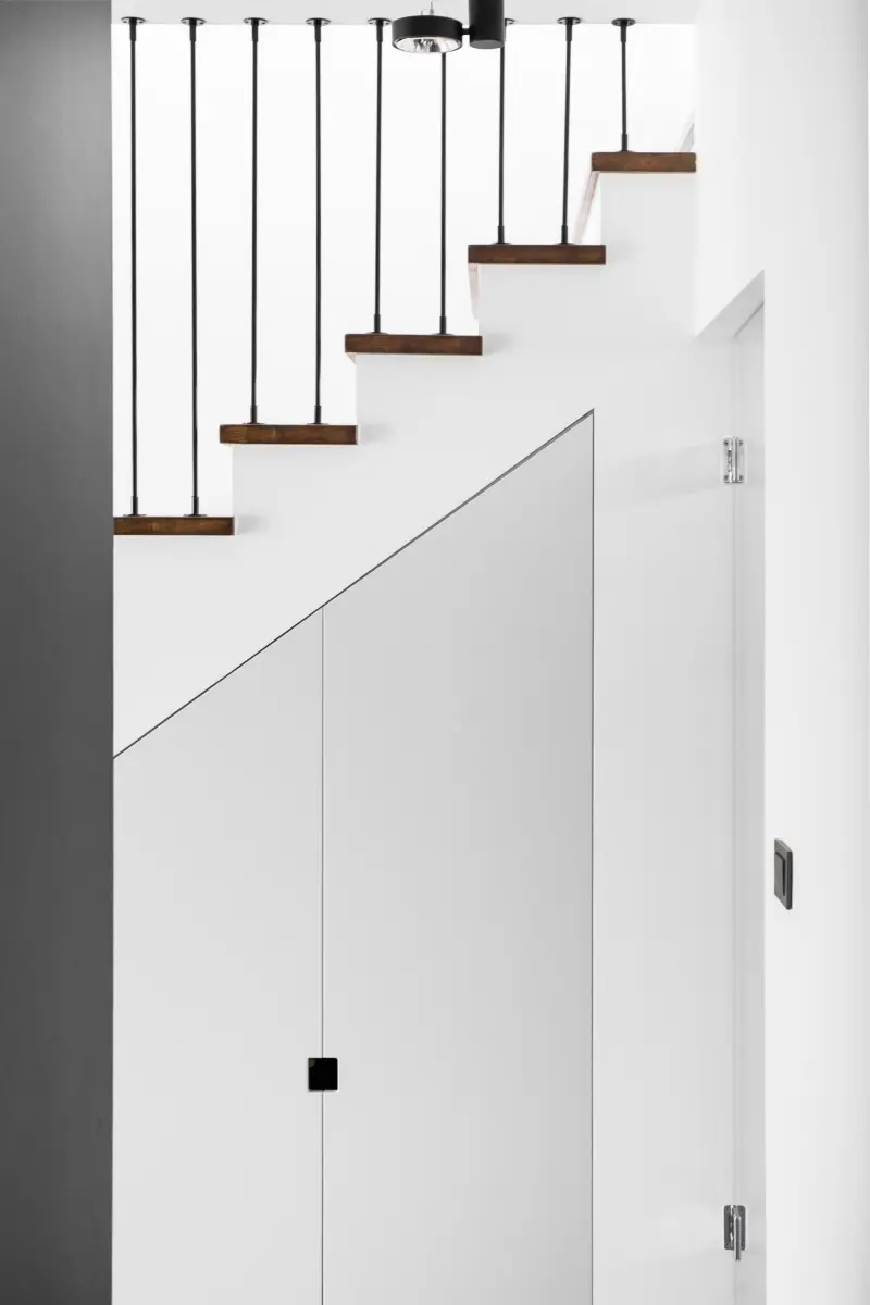 Krzesła przy stole jadalnianym, nawiązują do ikonicznego modelu MR Side Miesa van der Rohe. Natomiast kuchnia to hołd w stronę minimalizmu. Białe fronty tworzą jednolitą powierzchnię, optycznie powiększającą niewielkie pomieszczenie. W tym przypadku również zadbano o funkcjonalność i uzupełniono zabudowę o liczne szafki i szuflady, dzięki czemu jest dużo miejsca do przechowywania.