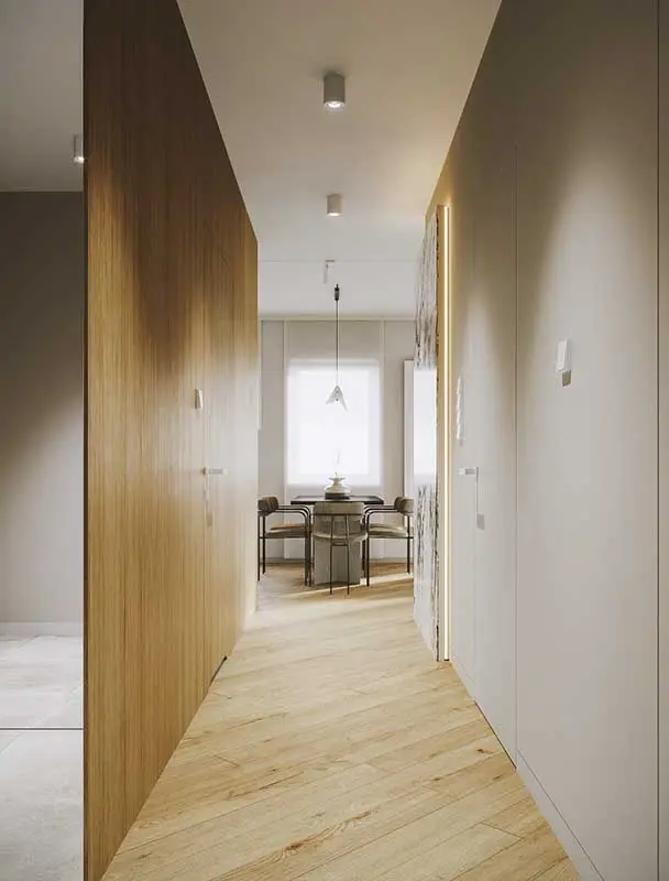 Mieszkanie o powierzchni 60m2 zlokalizowane jest w Łodzi w bezpośrednim sąsiedztwie Parku im. ks. Józefa Poniatowskiego. Inwestor chciał, aby wnętrze zostało urządzone w minimalistycznym stylu z wykorzystaniem naturalnych materiałów. Istotne było również stworzenie funkcjonalnej przestrzeni, którą będzie można adaptować do zmieniających się z upływem czasu potrzeb. Oryginalnie lokal składał się z przedpokoju, bardzo małej i nieustawnej garderoby, dwóch sypialni, łazienki oraz części dziennej połączonej z kuchnią. Projektanci z we’re architects znacznie przebudowali część wejściową. Pozwoliło to powiększyć łazienkę oraz zorganizować liczne miejsca do przechowywania. Zabudowy szaf wprowadzają do aranżacji rytm i harmonię oraz pozwalają ukryć wszystkie rzeczy.