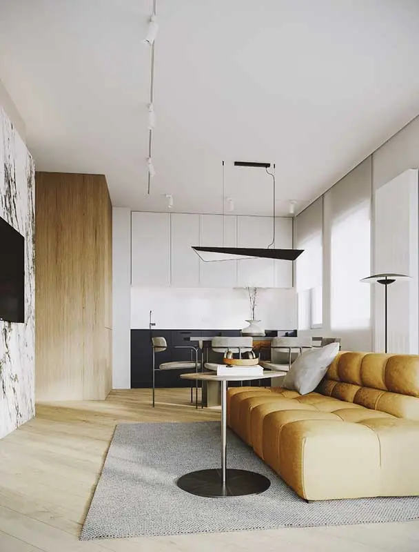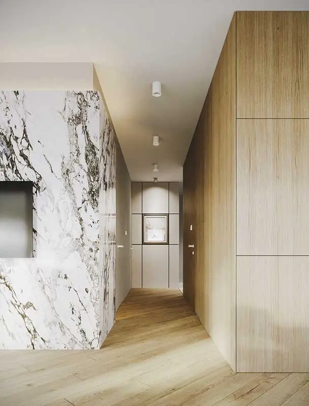 Jedna ze ścian korytarza obudowana jest laminowaną płytą drewnopodobną i płynnie przechodzi w wysoką zabudowę kuchni. Podłogę pokrywają deski ułożone pod kątem 45 stopni, których kolor został dobrany do laminatu tak, by te dwie płaszczyzny tworzyły monolit. Ciekawym akcentem jest ściana telewizyjna pokryta spiekiem kwarcowym o teksturze marmuru. Pochodzi on z kolekcji Grande Marble marki Marazzi. Dopełnieniem aranżacji jest wyjątkowa selekcja oświetlenia. Białe projektory na szynie od SternLight, stapiają się z powierzchnią sufitu, a ich rozmieszczenie pozwala na równomierne oświetlenie całej strefy dziennej. Nad stołem jadalnianym zawisła asymetryczna lampa Labry Wave, a do japońskiego minimalizmu nawiązuje podłogowa lampa Ginger z Marseta.