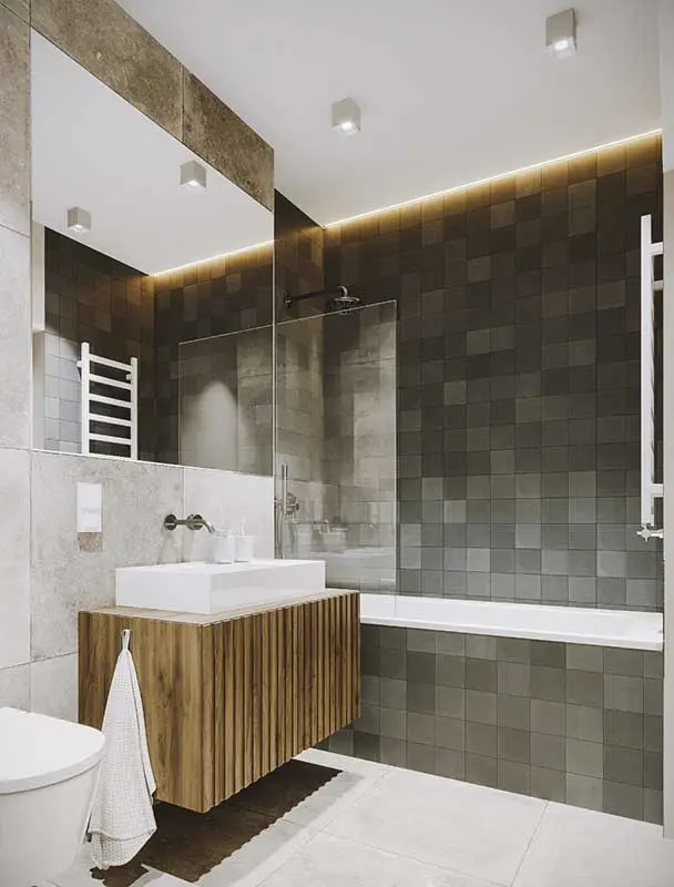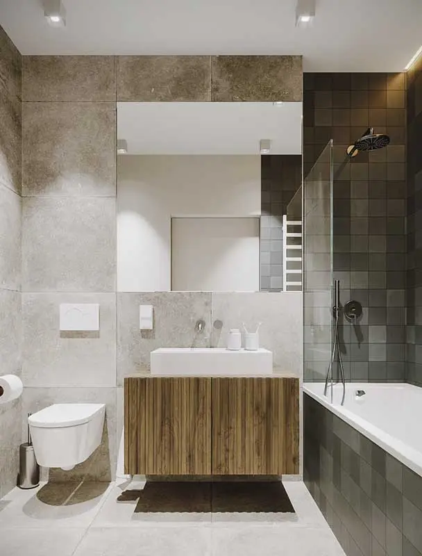 Wybór kolorystyki opiera się na ciepłych szarościach, ochrze w żółtym odcieniu oraz akcentu w postaci granatu, który występuje na dolnych szafkach kuchennych oraz blacie stołu. Męski, mocny klimat wprowadzają czarne stalowe elementy. Sypialnia jest najbardziej ascetycznym pomieszczeniem w domu, ale dzięki wykorzystaniu drewna w ciepłym odcieniu, panuje w niej atmosfera relaksu. Architektom udało się nawet wydzielić wnękę, która pełni funkcję domowego biura. Ostatnim pomieszczeniem mieszkania jest łazienka. Jej wykończenie jest spójne z ogólną stylistyką wnętrza. Wykorzystano tutaj gres imitujący beton, zestawiony z płytkami WOW Design z kolekcji SIX. Dzięki ich dużej różnorodności tonacji, powstała oryginalna mozaika. Idealne oświetlenie zapewniają oprawy natynkowe Surface od SternLight.