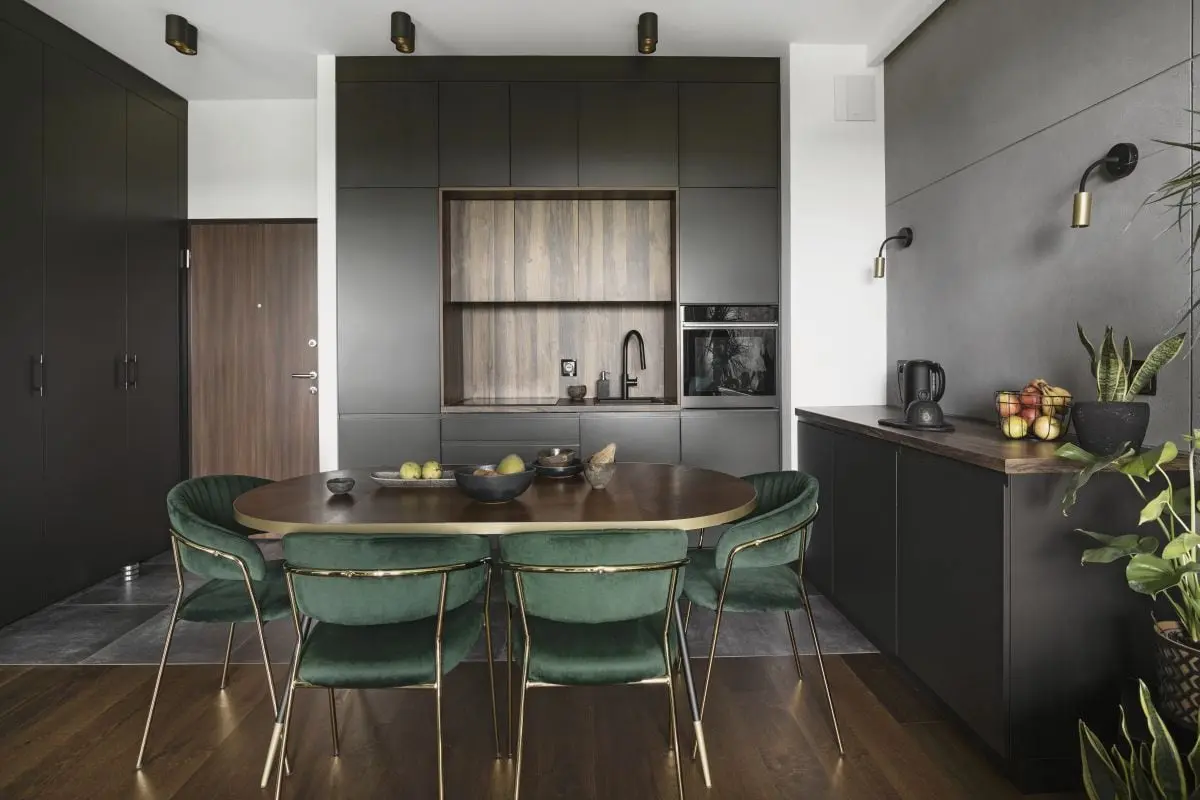 Strefę wypoczynkową dopracowano w najmniejszych detalach – wszystko po to, aby nadać jej przytulny charakter, sprzyjający wypoczynkowi. Ściany utrzymano w odcieniach szarości i kojącej, przygaszonej butelkowej zieleni. Podobny zielony odcień ma duża, komfortowa sofa, na której znalazły się miękkie welurowe poduszki w kilku różnych, ale stonowanych i spójnych kolorach. Te same odcienie powtarzają się na dywanie. Spójnym akcentem strefy wypoczynkowej jest biokominek, który podkreśla relaksacyjny charakter tego zakątka mieszkania. Ze strefą wypoczynkową łączy się kuchnia z jadalnią, tworząc przestrzenną, wspólną strefę dzienną. Do drewnianego stołu dobrano komfortowe krzesła ze złotym stelażem i welurowymi obiciami w odcieniu butelkowej zieleni, które korespondują z kanapą i ścianą w strefie wypoczynkowej. Minimalistyczną kuchnię wydzielono dzięki zastosowaniu kontrastującej, ciemnej zabudowy meblowej. Dodatek drewna i ciepłe oświetlenie przełamuje jej surowy charakter.
