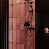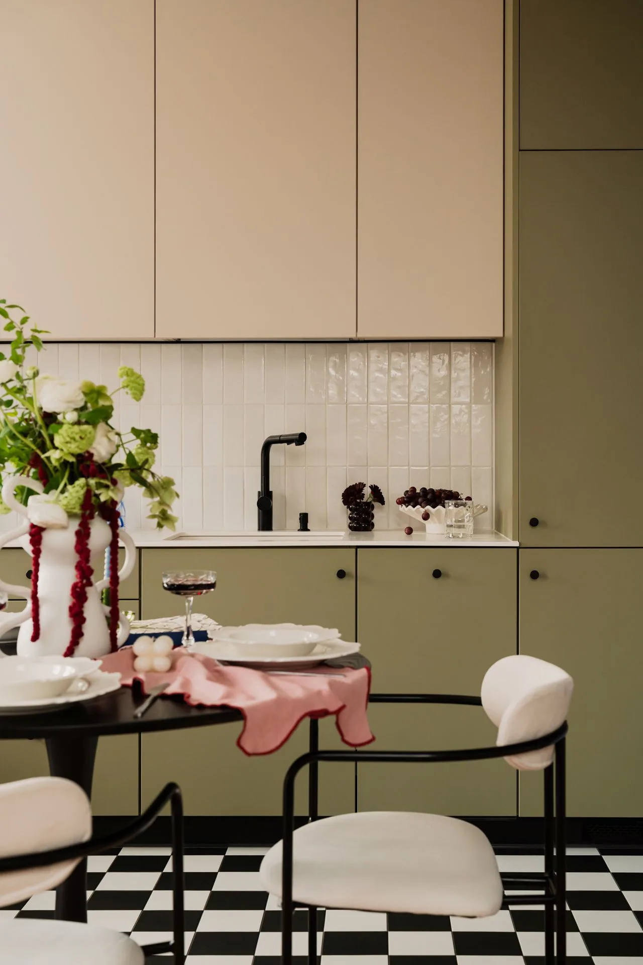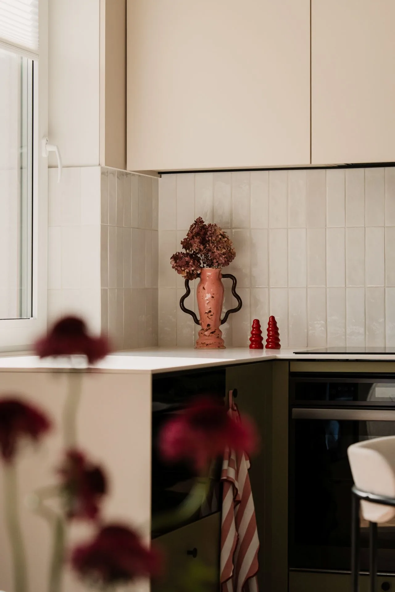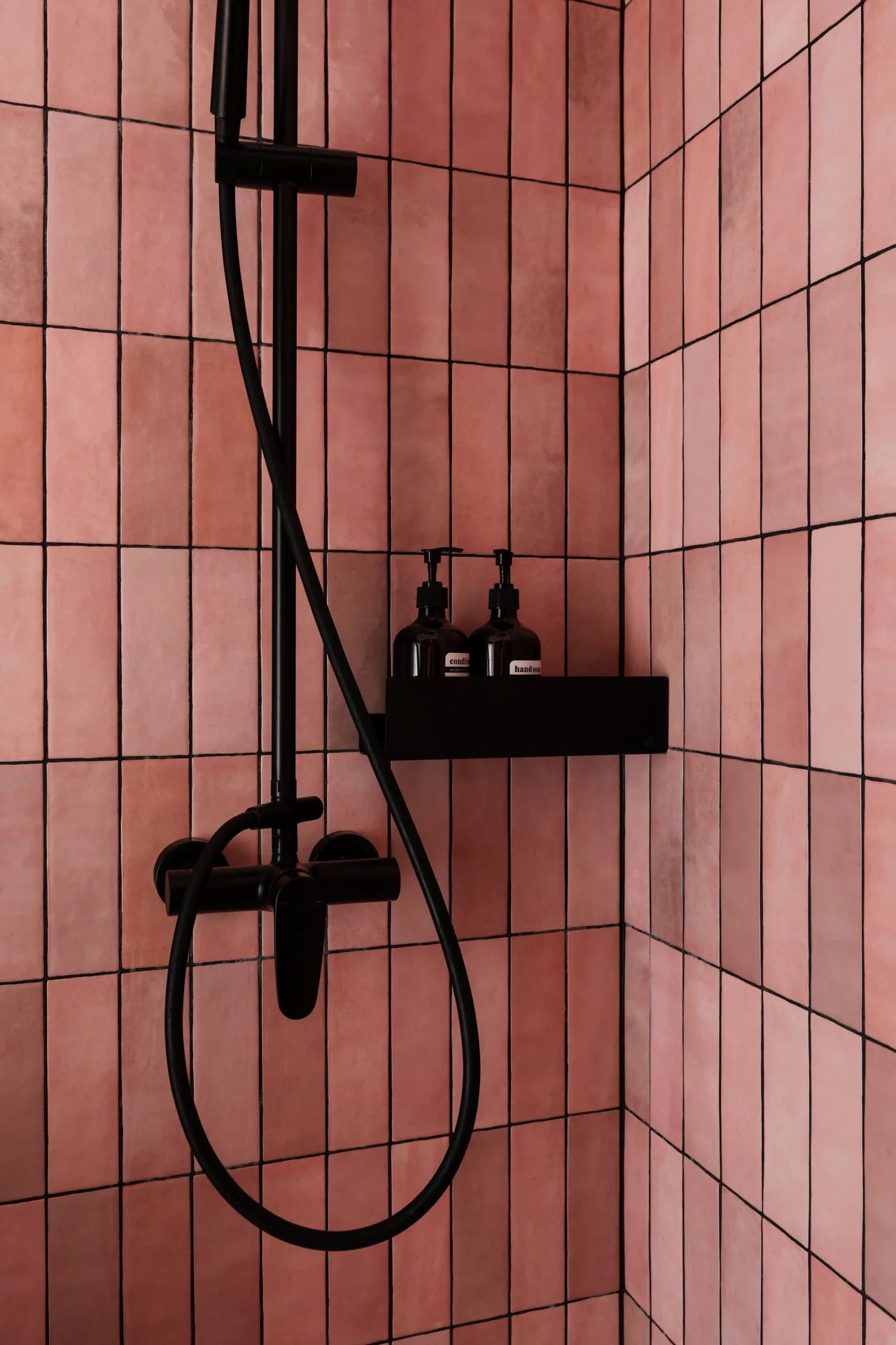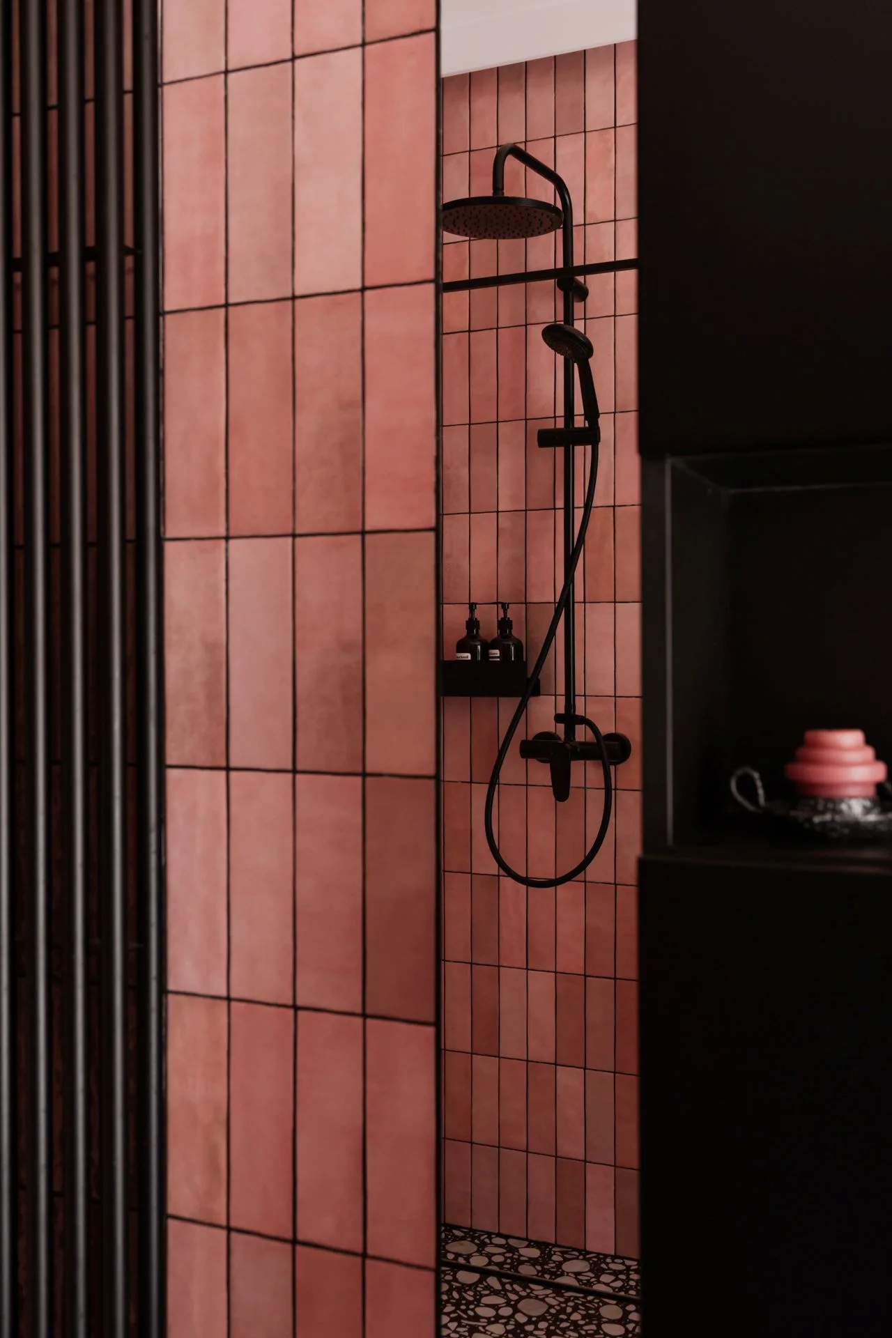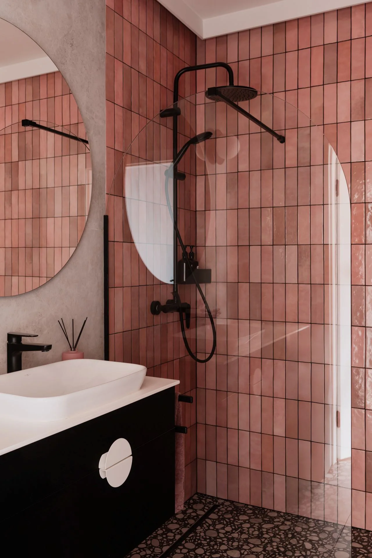 Łazienka z kolei wypełniona jest różowymi płytkami, które nie tylko dodają jej charakteru, ale również nawiązują do dziecięcych wspomnień właścicielki. To przestrzeń, w której kolor staje się językiem emocji i osobistych historii.