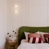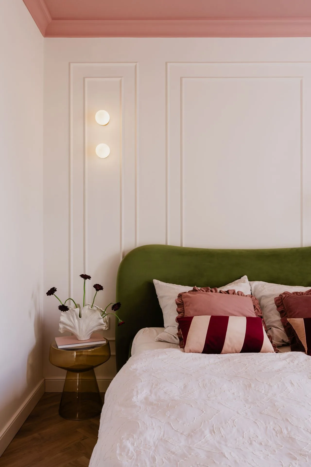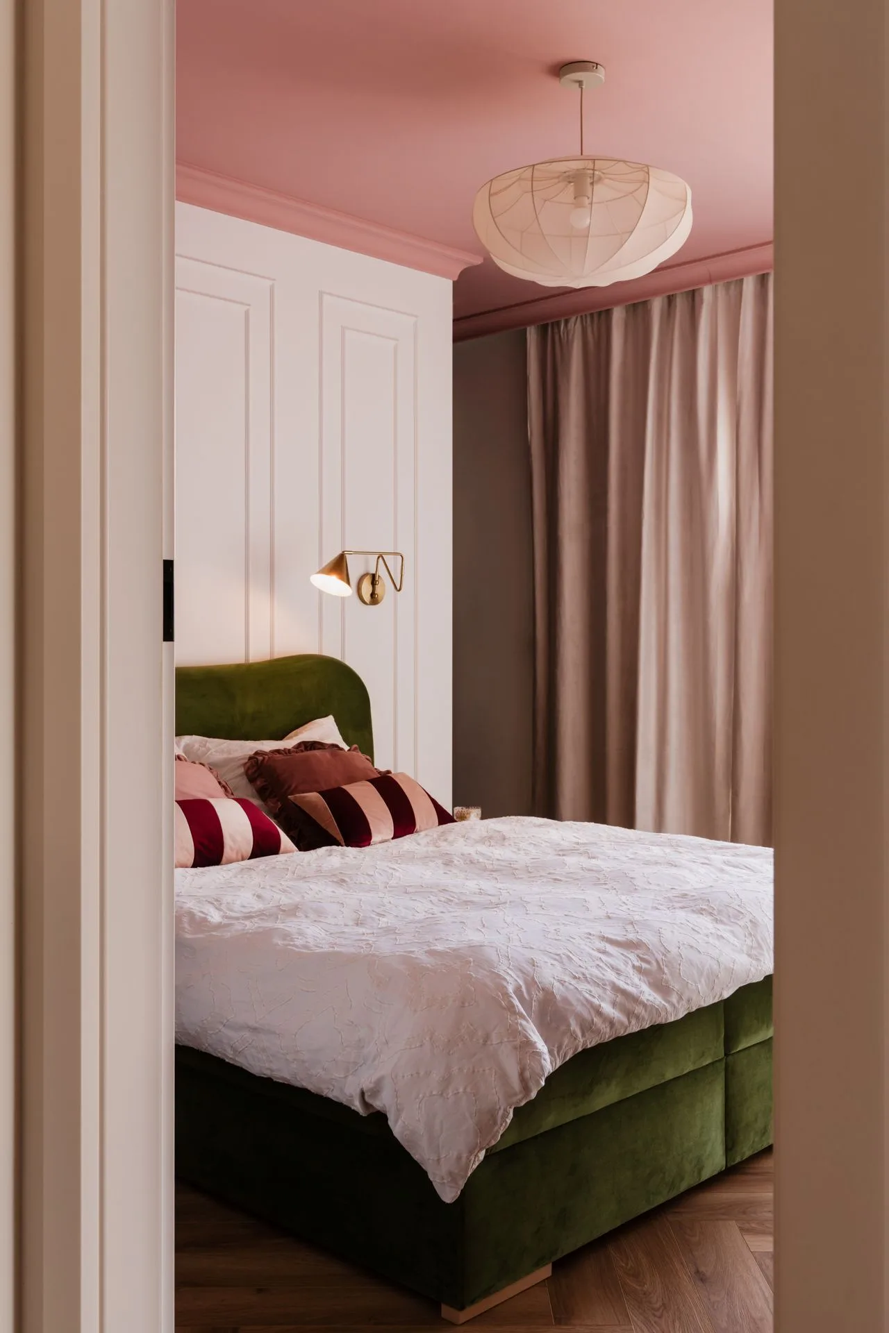 Jednym z najbardziej charakterystycznych elementów projektu są śmiałe kontrasty kolorystyczne i nieoczywiste zestawienia materiałów. W sypialni pudrowy sufit spotyka się z tapicerowanym na głęboki odcień zieleni łóżkiem, tworząc atmosferę zmysłowego spokoju przełamanego akcentem wyrazistego koloru.