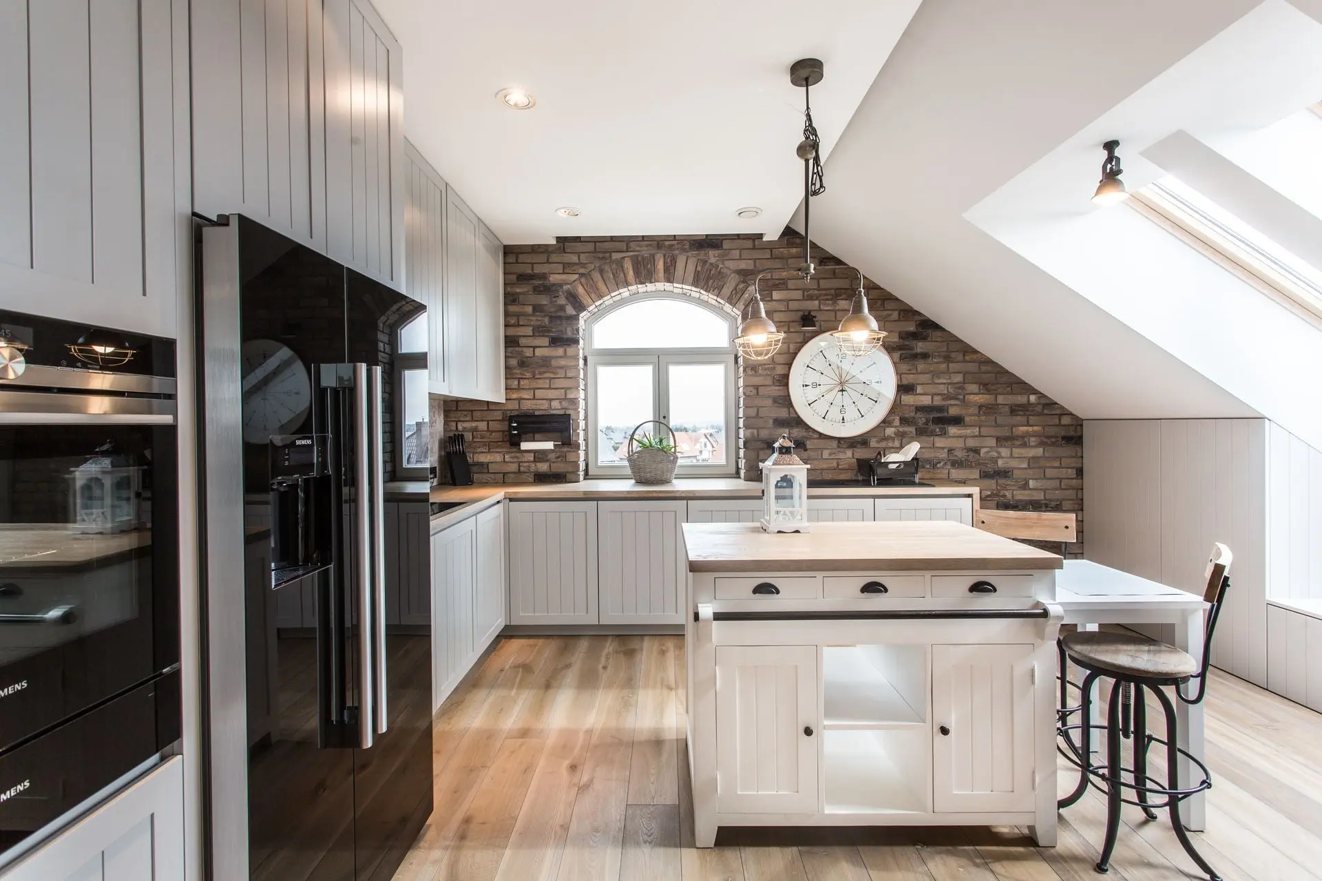 Wspaniała biała kuchnia urządzona trochę w stylu prowansalskim z ceglaną ścianą, sprzyja miłym rodzinnym chwilom.