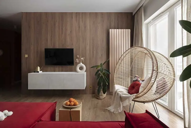 Głównym założeniem projektu było połączenie naturalności z silnym charakterem oraz zminimalizowanie ilości przedmiotów, które nie pełnią roli funkcjonalnej. Niewielka cześć dzienna miała sprzyjać relaksowi, dlatego nie mogła być przytłoczona zbyt dużą ilością mebli i dodatków. Projektantka postawiła więc na dużą i wygodą sofę w pięknym czerwonym kolorze, która stała się prawdziwym sercem salonu. Jednocześnie wybór takiej odważnej tapicerki był nawiązaniem do pasji właścicielki, jaką jest enologia, czyli nauka zajmująca się kwestiami związanymi z produkcją wina. Intensywność narożnika łagodzi jednolita ściana w okładzinie o teksturze drewna. Właśnie na niej zorganizowano strefę RTV z podwieszaną szafką imitującą beton. Meble wypoczynkowe uzupełnia wielkie rattanowe siedzisko, które szybko stało się ukochanym miejscem właścicielki. Zabudowa aneksu kuchennego i wyspy posiada fronty o kremowym kolorze. Zostały one połączone z marmurowymi płytkami o złotej żyle. Nad barem zawisły kamienne lampy w naturalnej barwie terakoty. Elegancji dodają biżuteryjne włączniki ze ściemniaczami oraz gniazda w kolorze matowego złota.