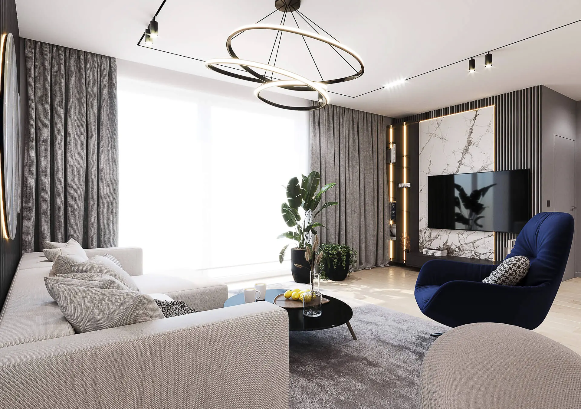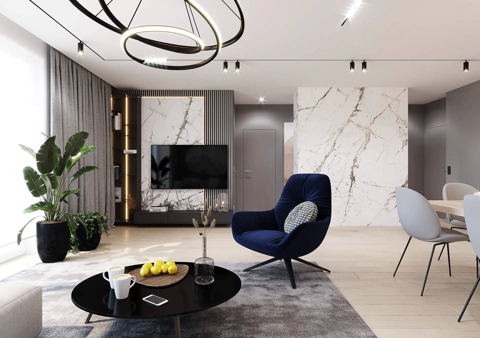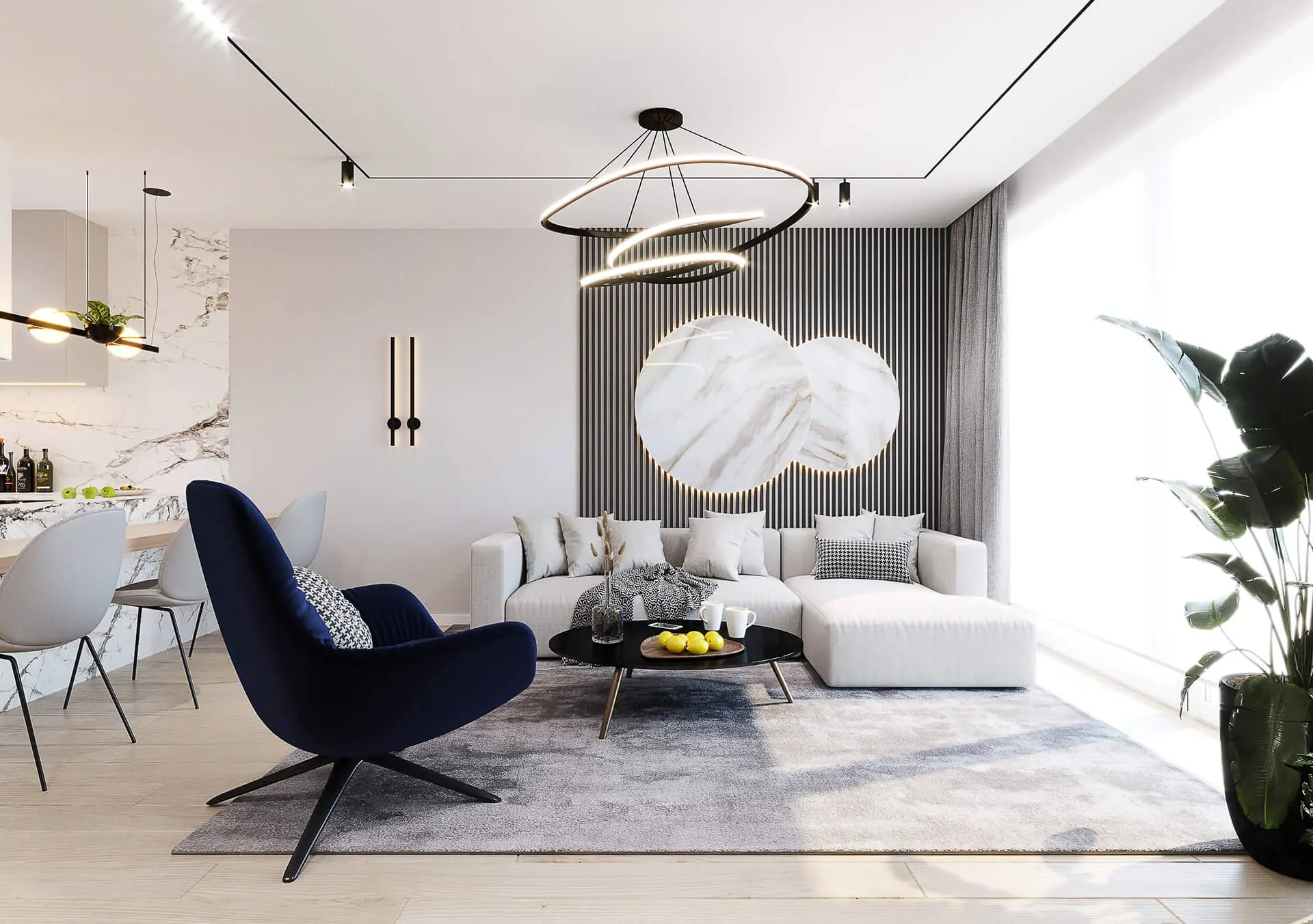 Po przejściu przedpokoju znajdziemy się w przestronnym i otwartym na kuchnię salonie. Jest to wnętrze nie tylko duże, ale i bardzo oryginalnie urządzone. Architekci zaaranżowali je tak, by było ono przyjemne zarówno dla dorosłych, jak i dzieci. Jest to przestrzeń wspólna, z której korzystać będą zarówno dorośli, dzieci, jak i odwiedzający rodzinę goście. Z tego też powodu musiało ono prezentować się bardzo efektownie. Jak zostało urządzone? Architekci pomyśleli o tym, by znalazł się tu kącik wypoczynkowy oraz część jadalna. Część wypoczynkową tworzą wygodna kanapa rogowa w beżowym kolorze oraz tapicerowany fotel w pięknym, granatowym kolorze. Meble te dopełnia czarny, okrągły stolik kawowy. Znalazły się one na tle ciemnej ściany obłożonej spiekiem kwarcowym oraz ciemnymi lamelami. Ten element jest z resztą bardzo typowym detalem, który często wykorzystywany jest przez studio projektowe Kaim.work. Komfortowy wygląd zapewniają dodatkowo rośliny doniczkowe, które stanowią równocześnie modny dodatek w salonie.