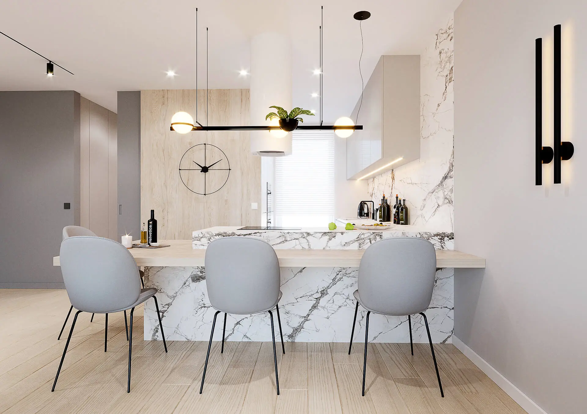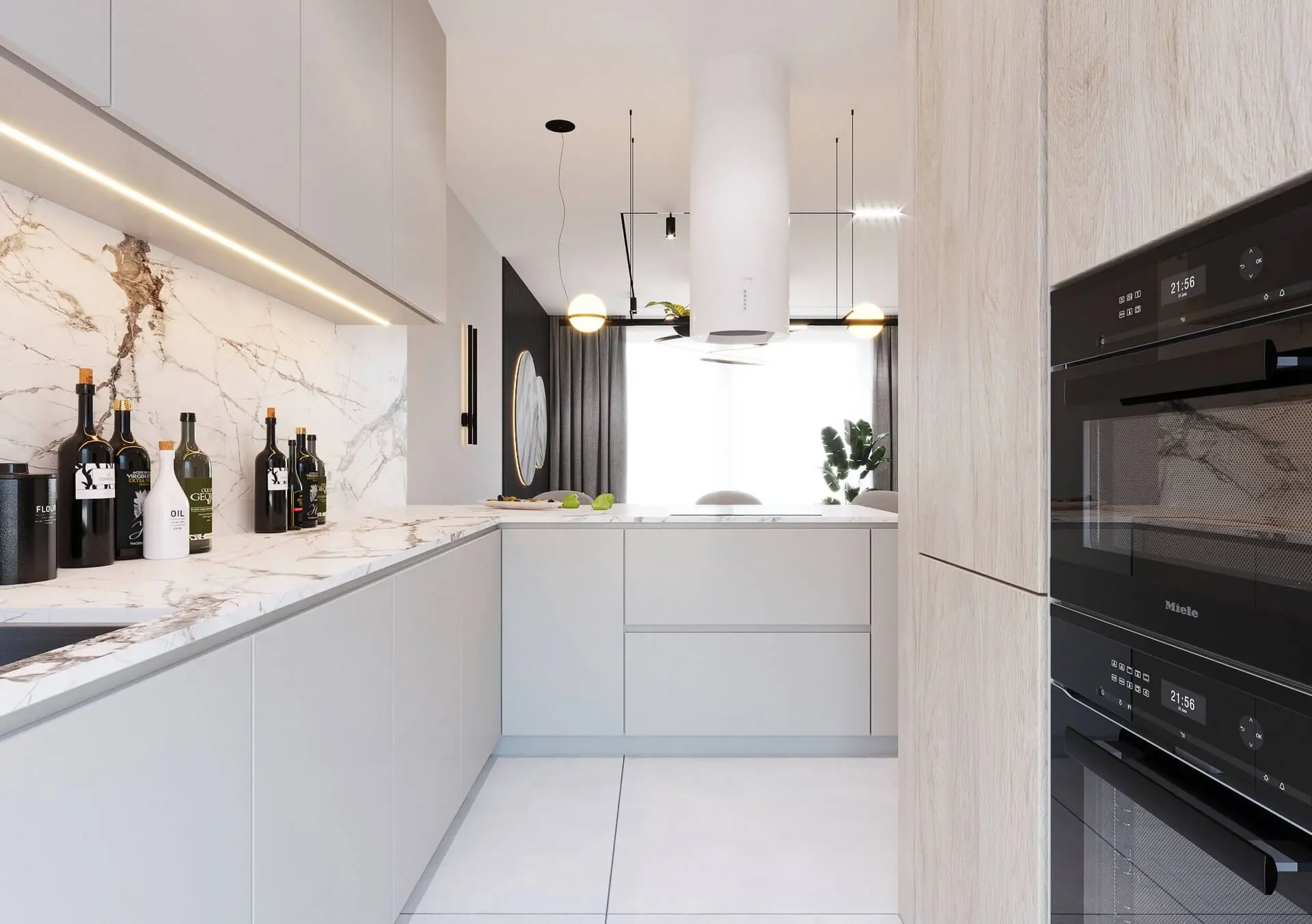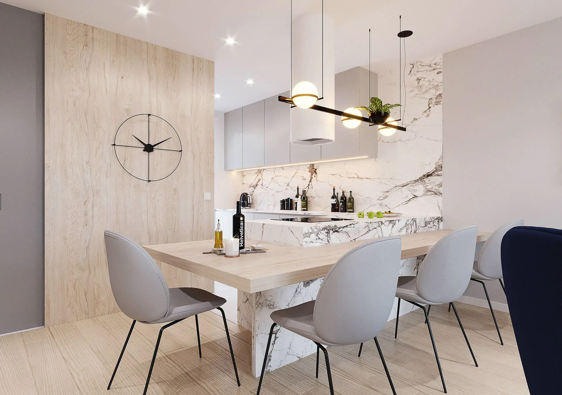 Salon tworzy całość wraz z otwartą kuchnią. W przeciwieństwie jednak od salonu, kuchnia urządzona jest w nieco innej kolorystyce, choć z utrzymaniem podobnego do salonu stylu. Wykorzystano tu przede wszystkim jasne kolory mebli oraz jasne ściany z drewnianymi okładzinami, czy jasnym spiekiem kwarcowym. Jednak efektu nadaje jasny blat kuchenny, w piękny wzór. W kuchni nie mogło zabraknąć wygodnych krzeseł, które zostały rozmieszczone wzdłuż drewnianego blatu zamocowanego na kwarcowej wyspie kuchennej.