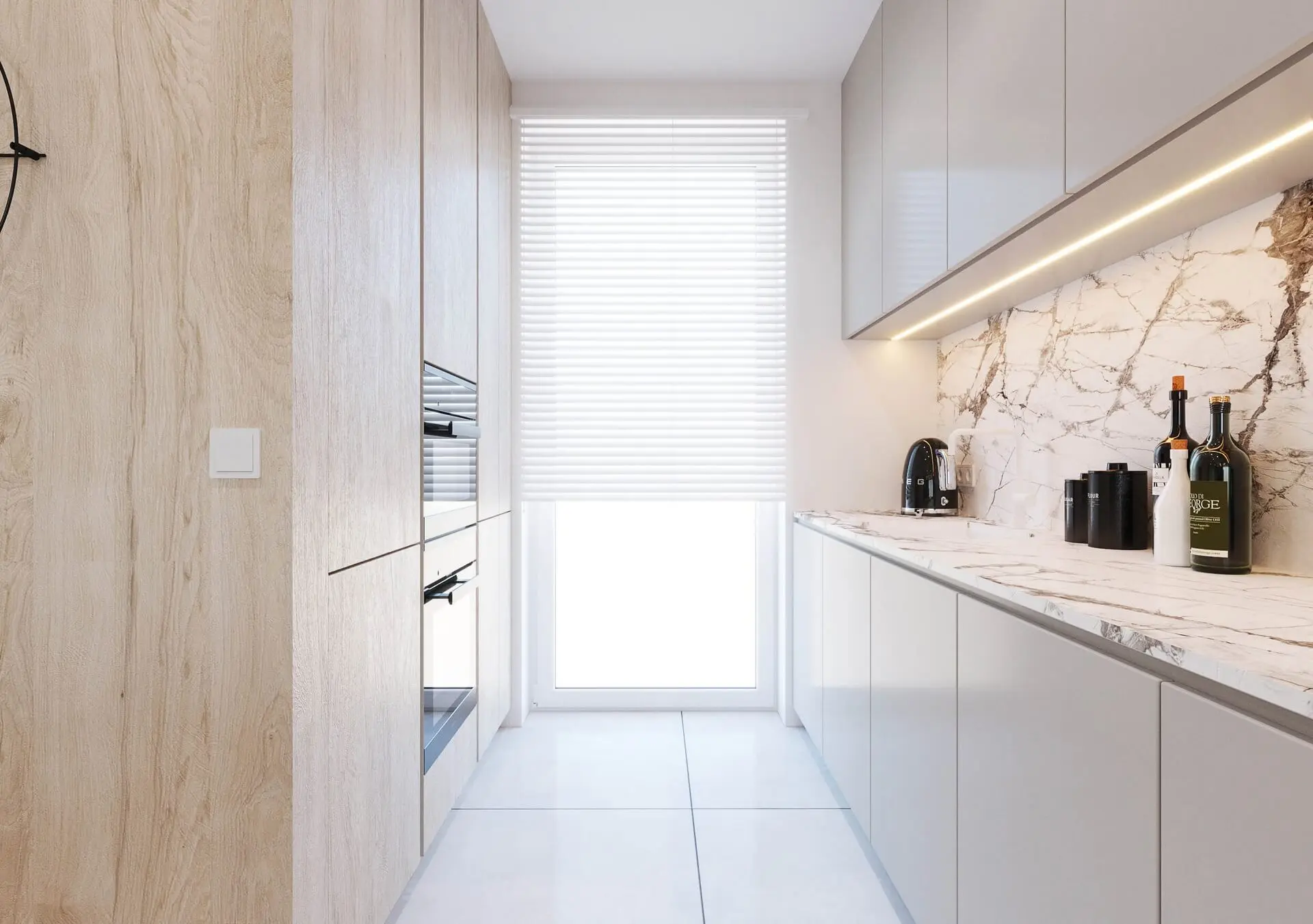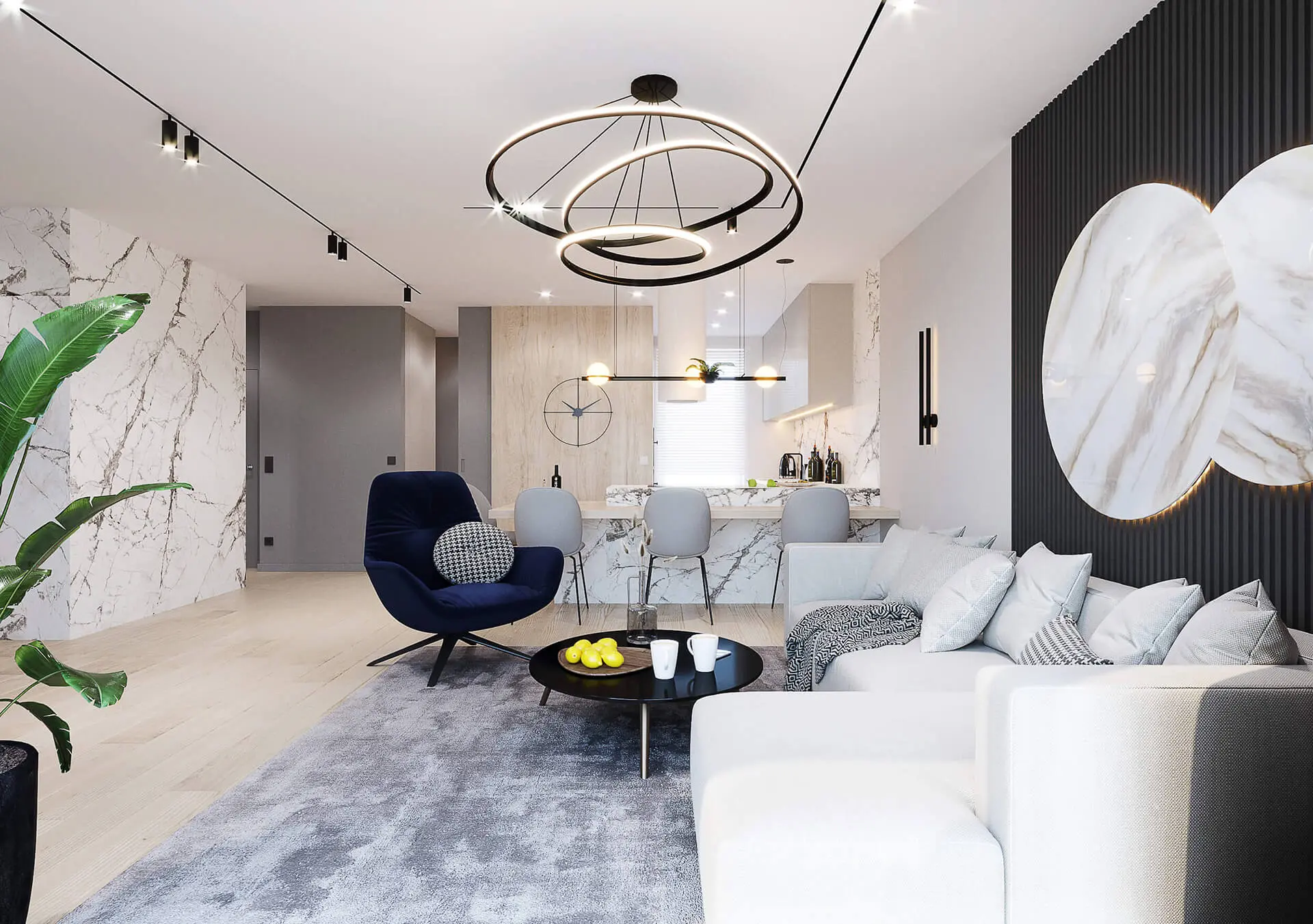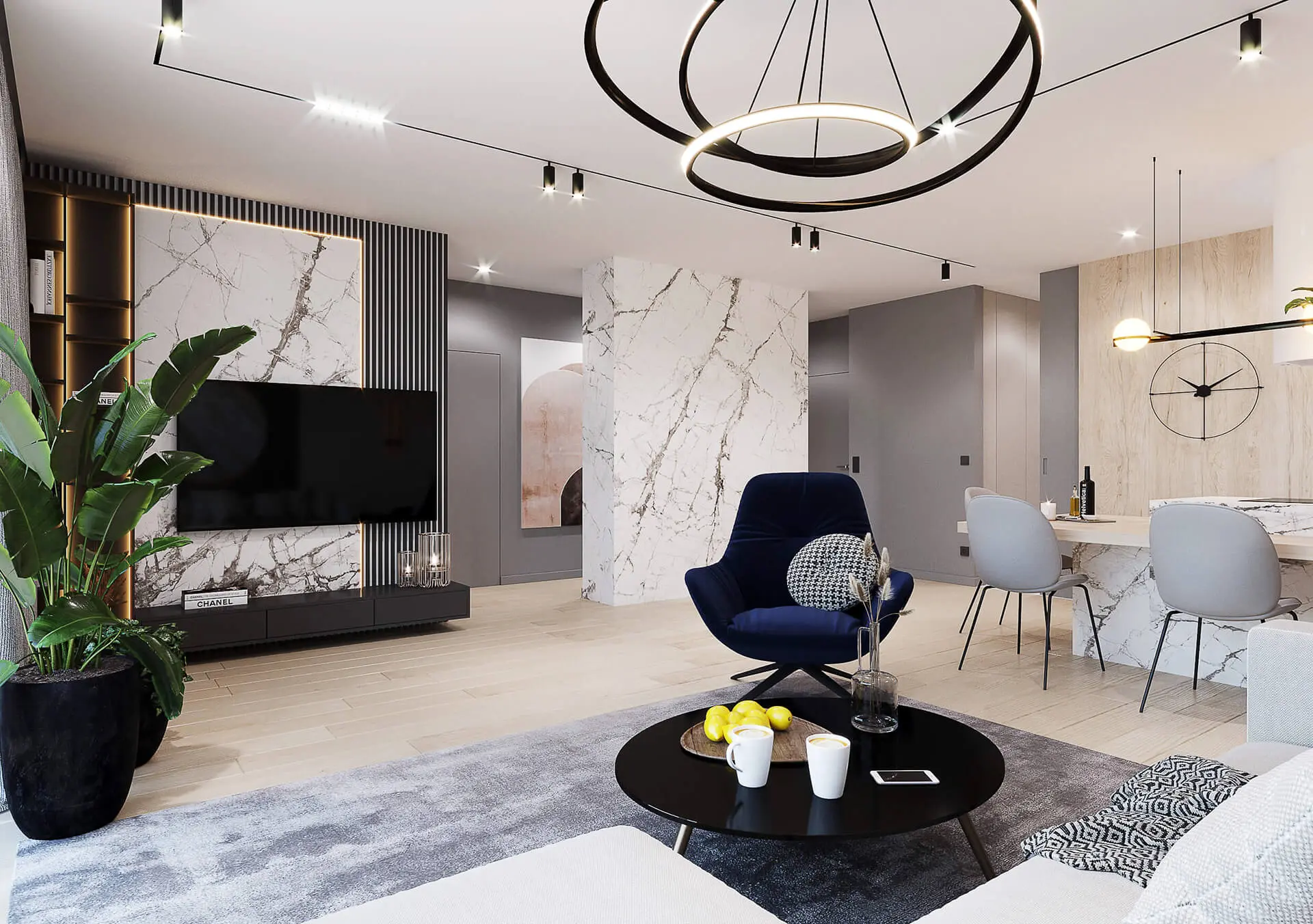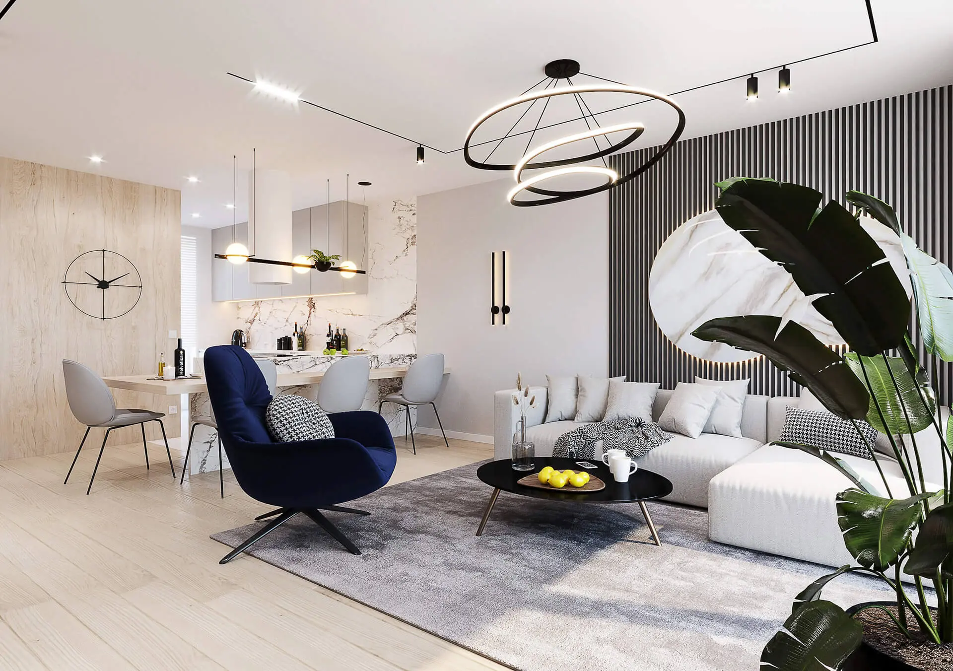 Salon tworzy całość wraz z otwartą kuchnią. W przeciwieństwie jednak od salonu, kuchnia urządzona jest w nieco innej kolorystyce, choć z utrzymaniem podobnego do salonu stylu. Wykorzystano tu przede wszystkim jasne kolory mebli oraz jasne ściany z drewnianymi okładzinami, czy jasnym spiekiem kwarcowym. Jednak efektu nadaje jasny blat kuchenny, w piękny wzór. W kuchni nie mogło zabraknąć wygodnych krzeseł, które zostały rozmieszczone wzdłuż drewnianego blatu zamocowanego na kwarcowej wyspie kuchennej.