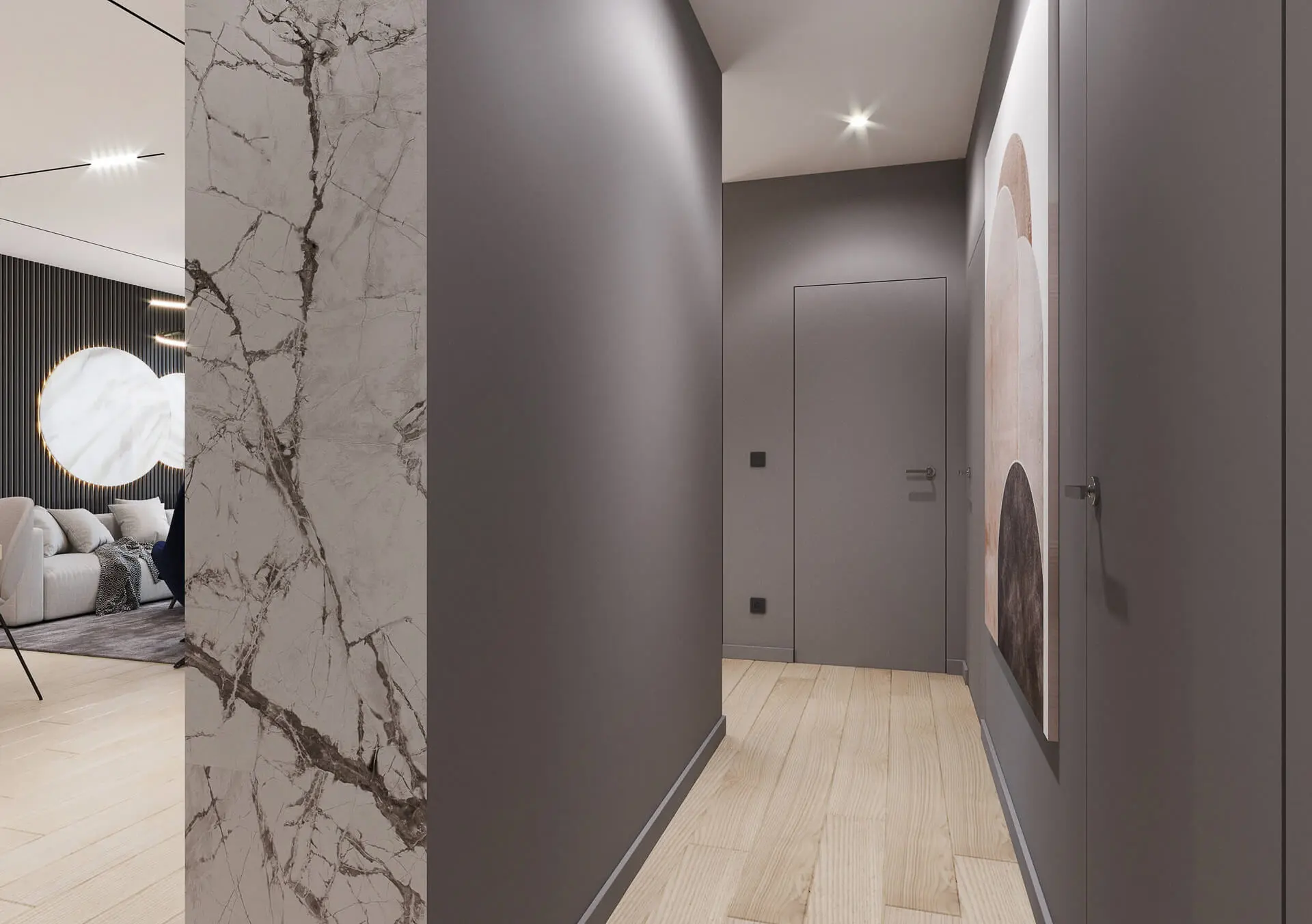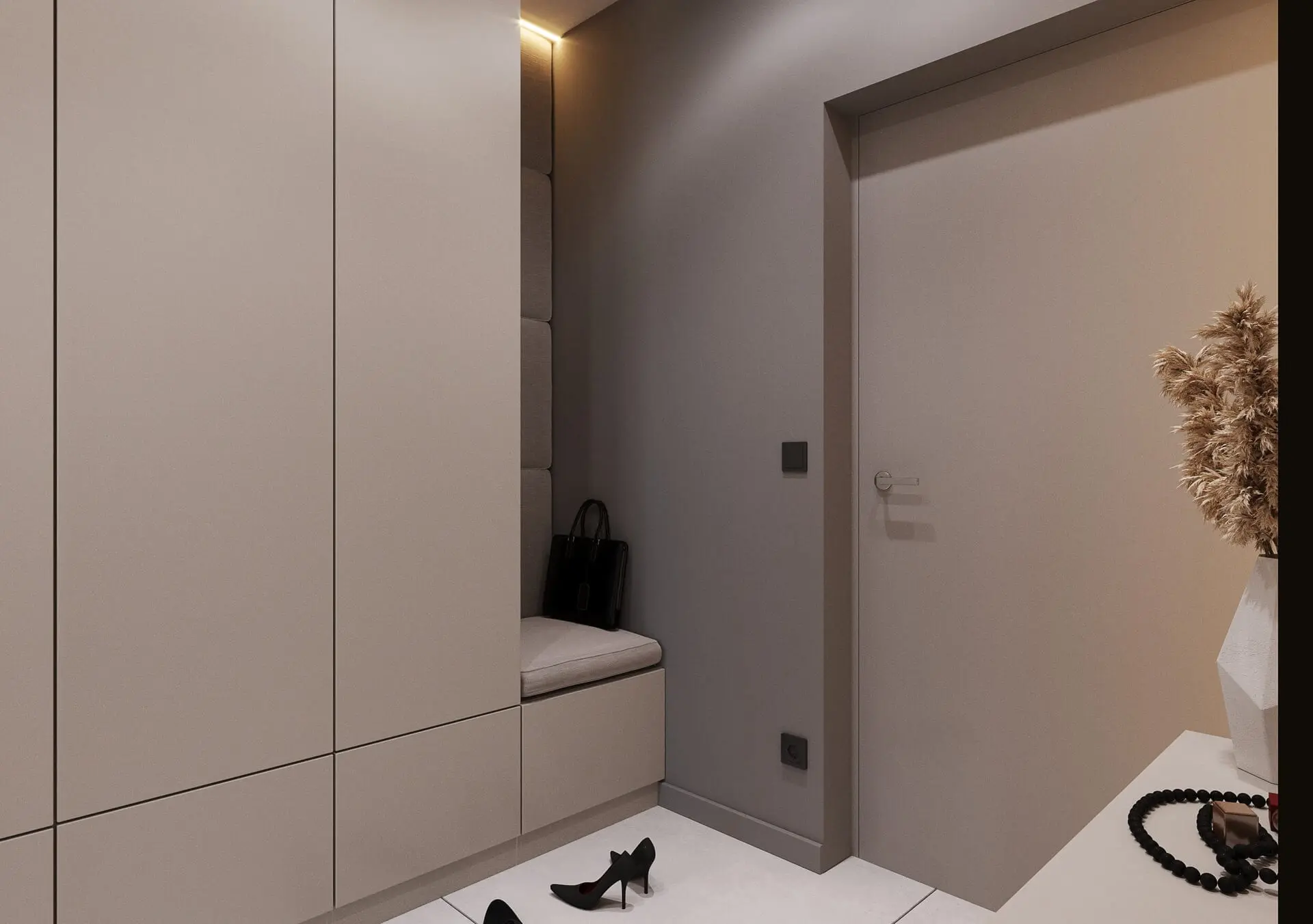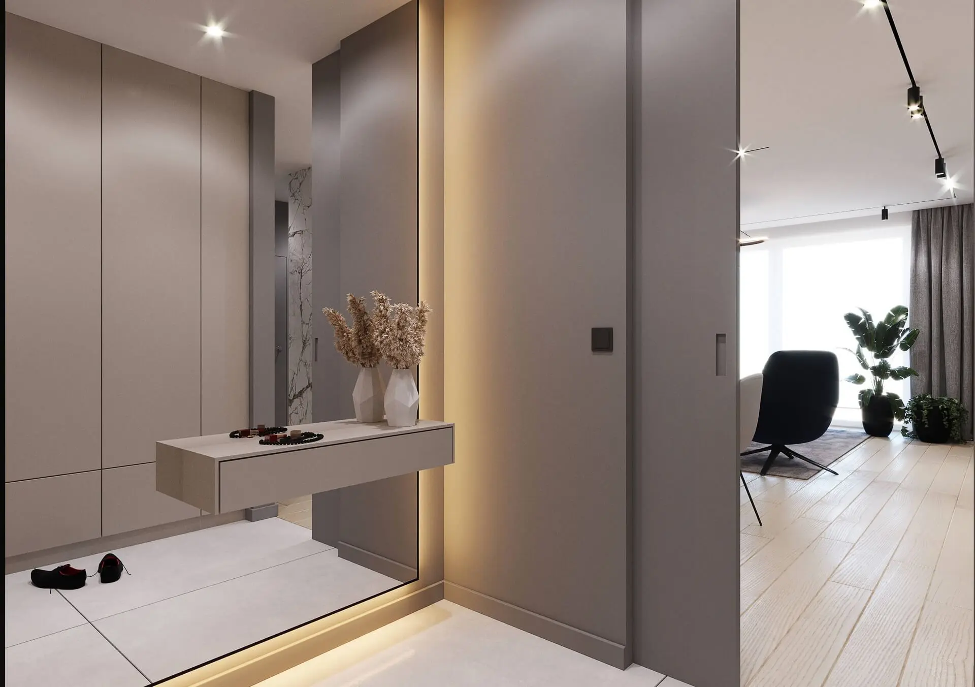 Wszystkie wnętrza, jakie powstały w tym przestronnym apartamencie są bardzo spójne i jednolite stylistycznie. Można poczuć się w nich niezwykle komfortowo od razu po wejściu do domu. Jasne barwy, spiek kwarcowy, czy lamele to elementy, które powtarzają się praktycznie w każdym wnętrzu apartamentu. Dodatkowym atutem są z pewnością otwarte przestrzenie wspólne, a także komfortowe sypialnie przeznaczone tylko dla rodziny. W ten sposób powstał apartament, który jest wygodny oraz prezentuje się niebanalnie. Ów niebanalny wygląd można zauważyć tuż po przekroczeniu progu. Znajduje się tu modnie i funkcjonalnie urządzony przedpokój z dużą szafą oraz wielkim lustrem. Urządzono go w beżowej kolorystyce, co wprowadza natychmiast przytulny charakter apartamentowi. Obok szafy i luster znalazło się tu modne siedzisko oraz oryginalna grafika na ścianie, która dodaje ekskluzywnego i niebanalnego wyglądu przedpokojowi. Wchodząc tu od razu wiadomo, że trafiliśmy w miejsce urządzone w sposób niebanalny i bardzo stylowy.
