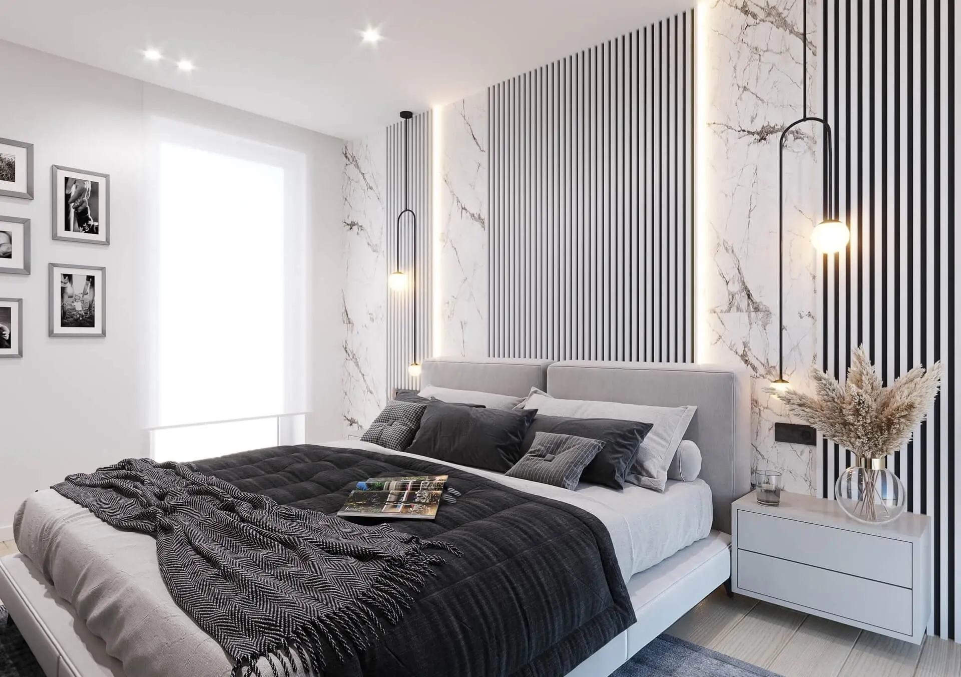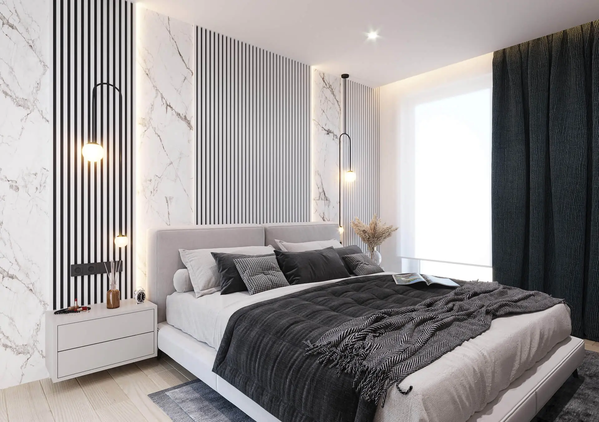 Obok oryginalnych akcentów architekci postawili na praktyczne i popularne rozwiązania chociażby w postaci mebli. Takie rozwiązania dostępne są zarówno w sypialniach dziecięcych, jak i w sypialni dorosłych. Wnętrze urządzone zostało z nastawieniem na spełnienie potrzeb rodziców. Jest dzięki temu funkcjonalne i estetyczne. Świetnie koresponduje też z resztą wnętrz apartamentu. Centralne miejsce zajęło tu łóżko małżeńskie. Jest ono jasne, lecz nie pozbawione ciemnych akcentów w postaci narzuty, czy poszewek na poduszkach. Oprócz tych elementów, nastrój wnętrza budują i inne dodatki, takie jak chociażby grube zasłony, czy modny dywan. Piękny i niepowtarzalny efekt udało się osiągnąć dzięki zastosowaniu tapety imitującej spiek kwarcowy oraz białych lameli. Równocześnie te elementy idealnie nawiązują do stylu w jakim urządzono pozostałe wnętrza apartamentu.