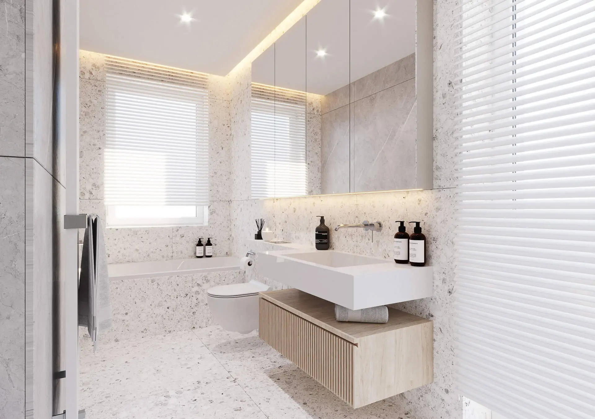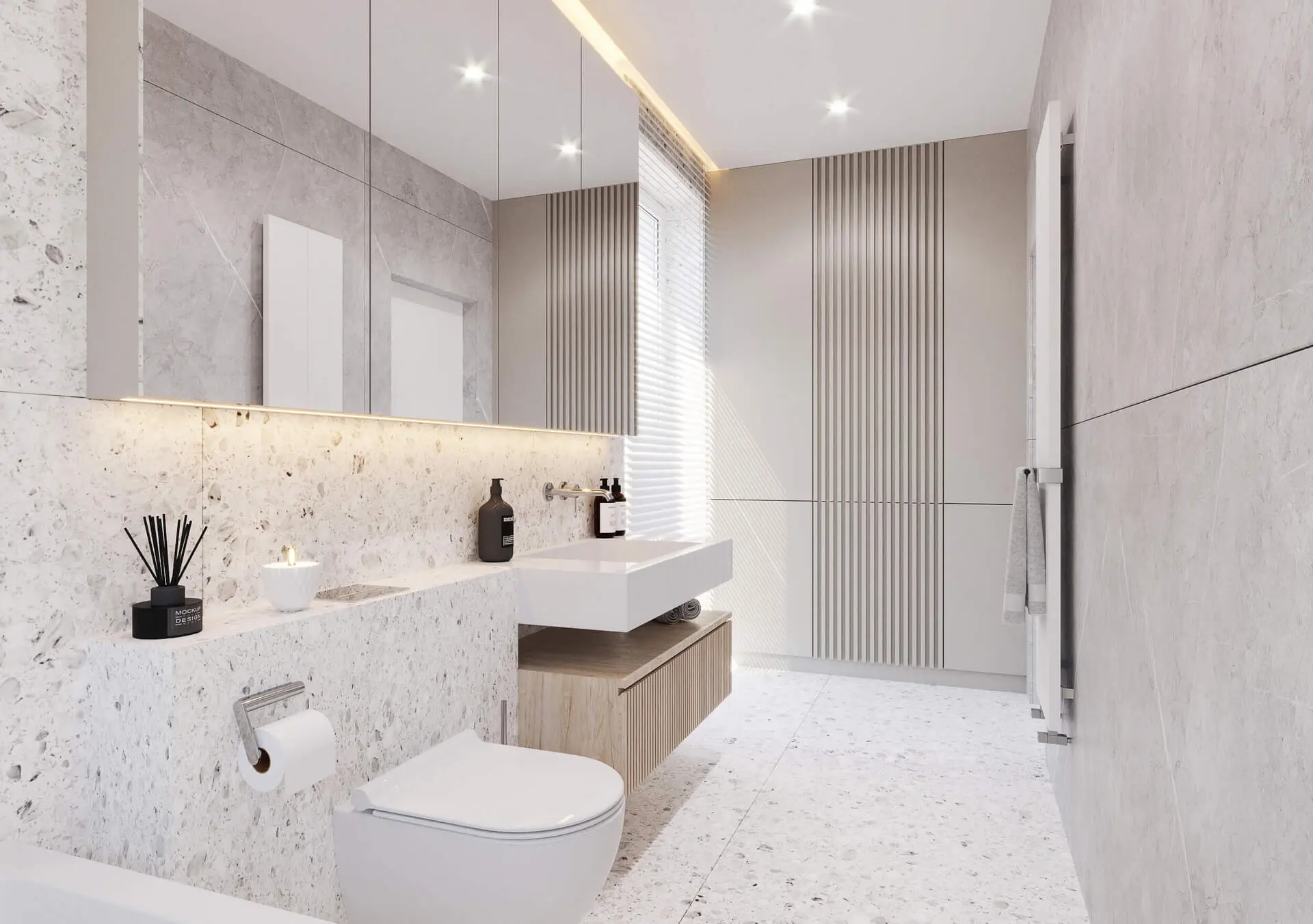 Łazienka w tym apartamencie stanowi nieco odrębny byt. Ma ona oryginalny charakter, wyróżniając się na tle pozostałych pomieszczeń. Nie jest ona jednak niespójna z resztą apartamentu. Nawiązuje ona do pozostałych wnętrz za sprawą jasnej kolorystyki oraz lameli, które zobaczyć można na szafce pod umywalką. Niemniej jednak efekt robią tu ściany wykończone przy pomocy płytek o delikatnym, kamyczkowym wzorze. W efekcie wnętrze prezentuje się komfortowo oraz bardzo pięknie.