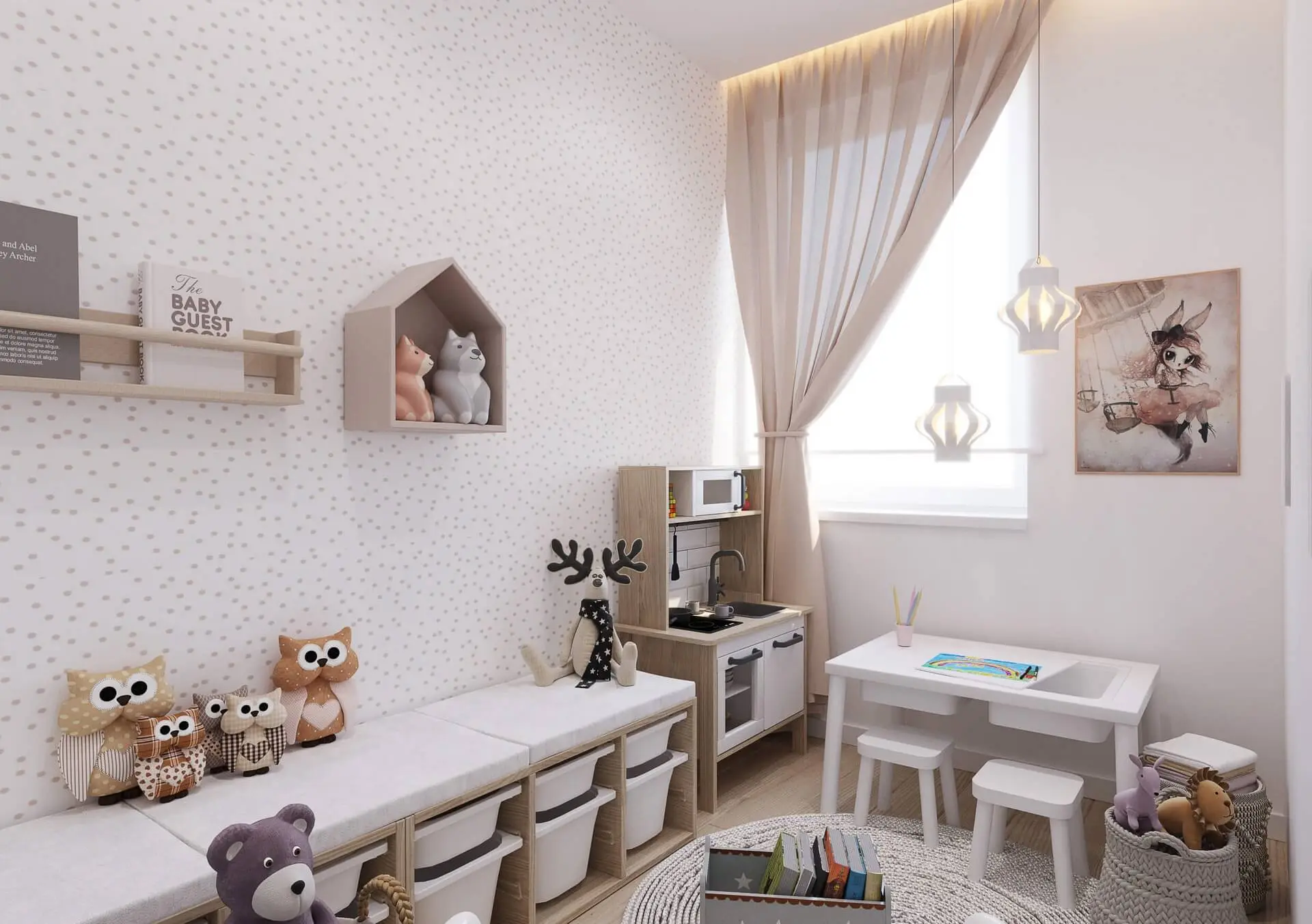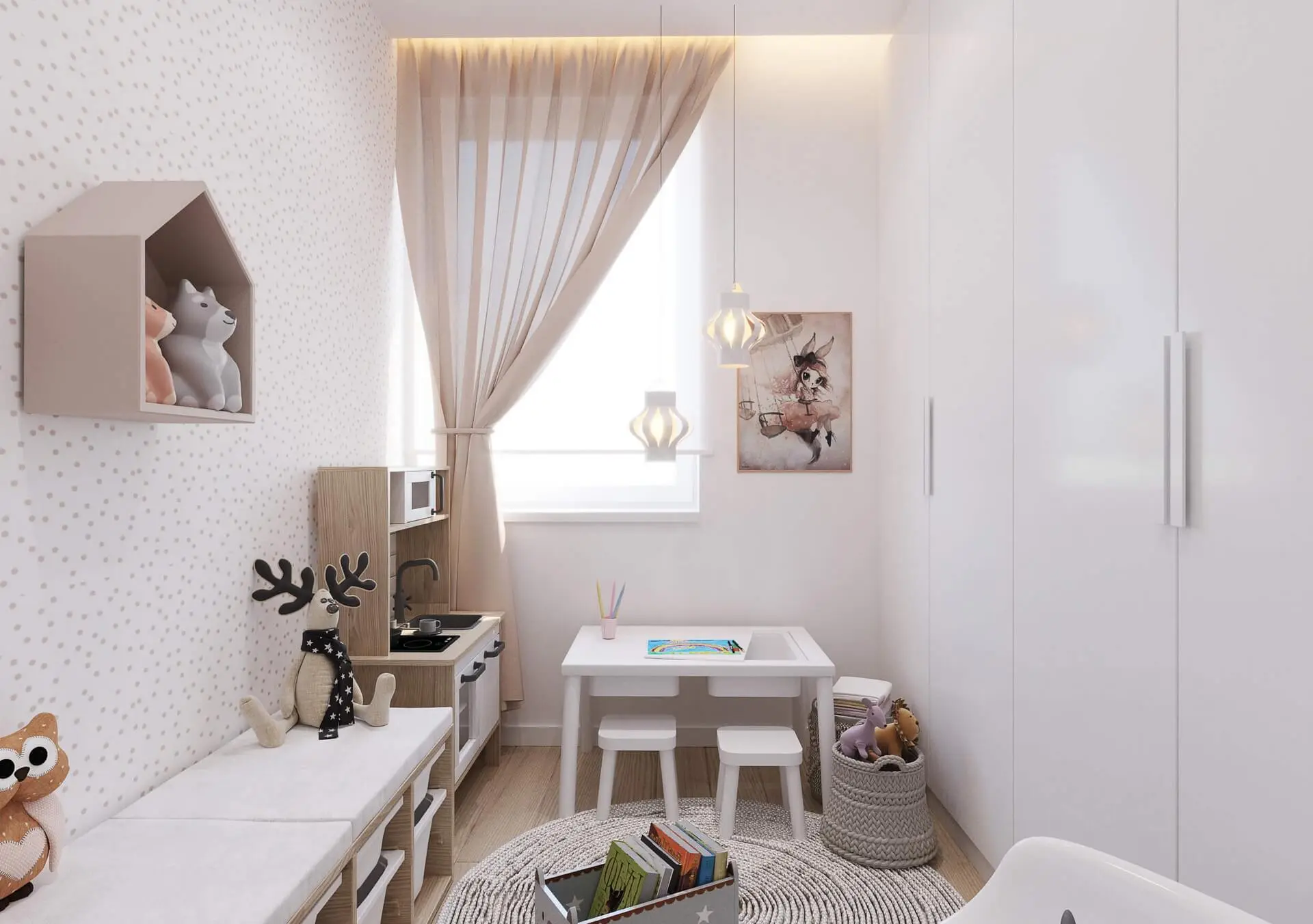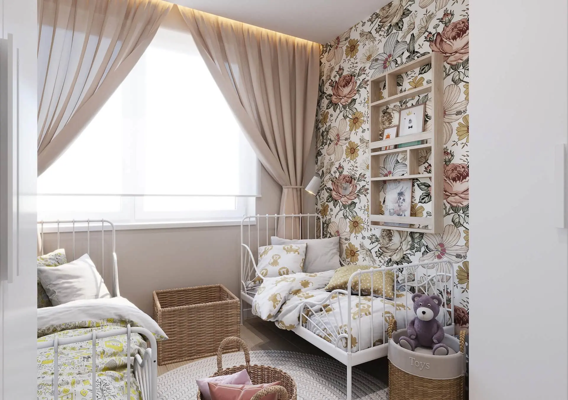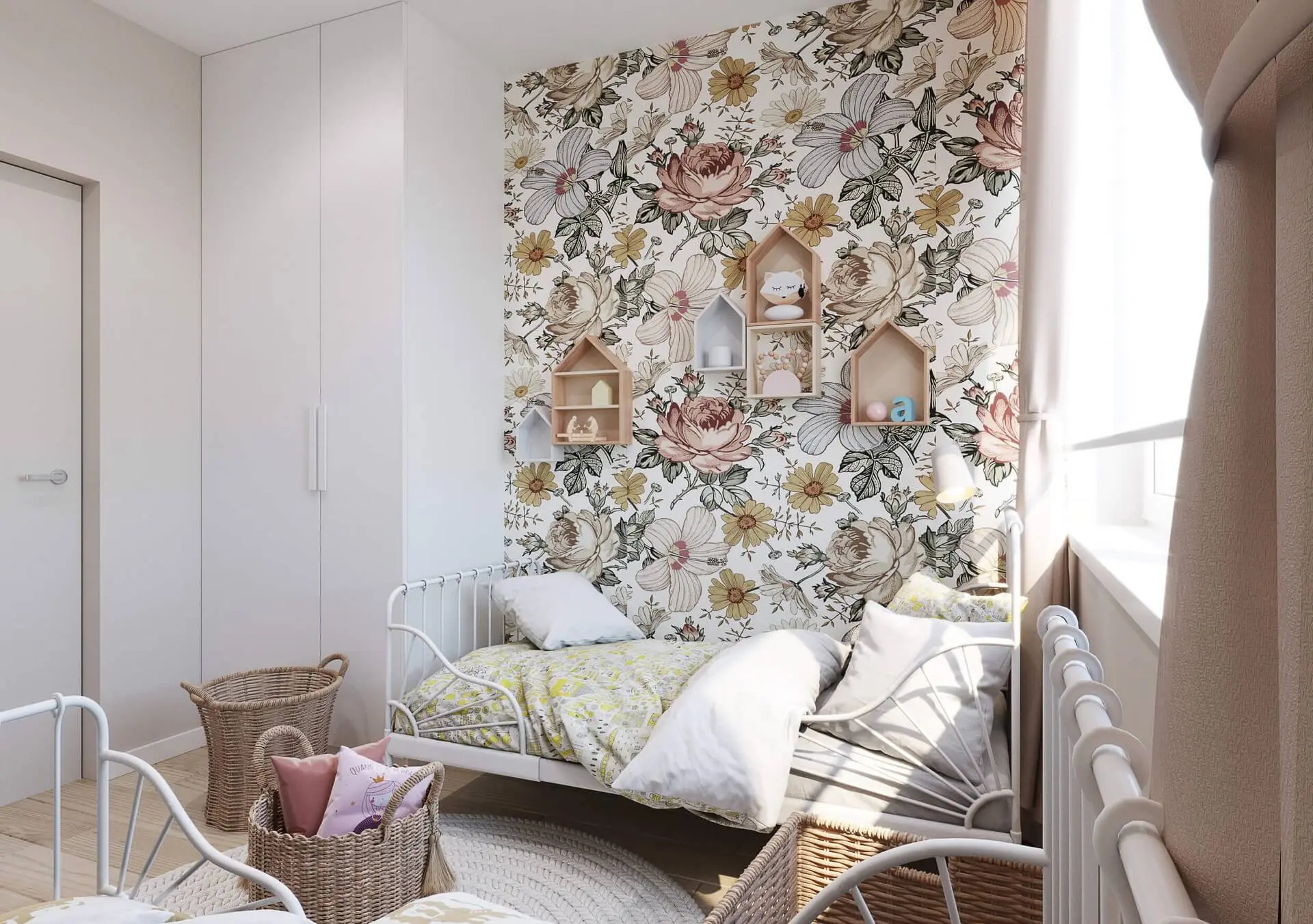 Pokoje stworzone dla dziewczynek nawiązują bardzo wyraźnie do stylu boho. Dzięki niebanalnym rozwiązaniom sypialnia dziewczynek oraz pokój zabaw prezentują się stylowo oraz zapewniają maksimum komfortu. Uwagę z pewnością przykuwają kwiecista tapeta w sypialni dzieci, czy jasna nakrapiana tapeta w pokoju zabaw. To jednak nie jedyne elementy boho. Znaleźć można tu mnóstwo koszyków wiklinowych, czy piękne łóżka, które dodają wnętrzu uroku oraz zapewniają bardzo praktyczny akcent. Tak urządzona sypialnia to gwarancja, że będzie ona modna nie tylko w jednym sezonie, ale przez co najmniej kilka lat i nie znudzi się ona dzieciom.
