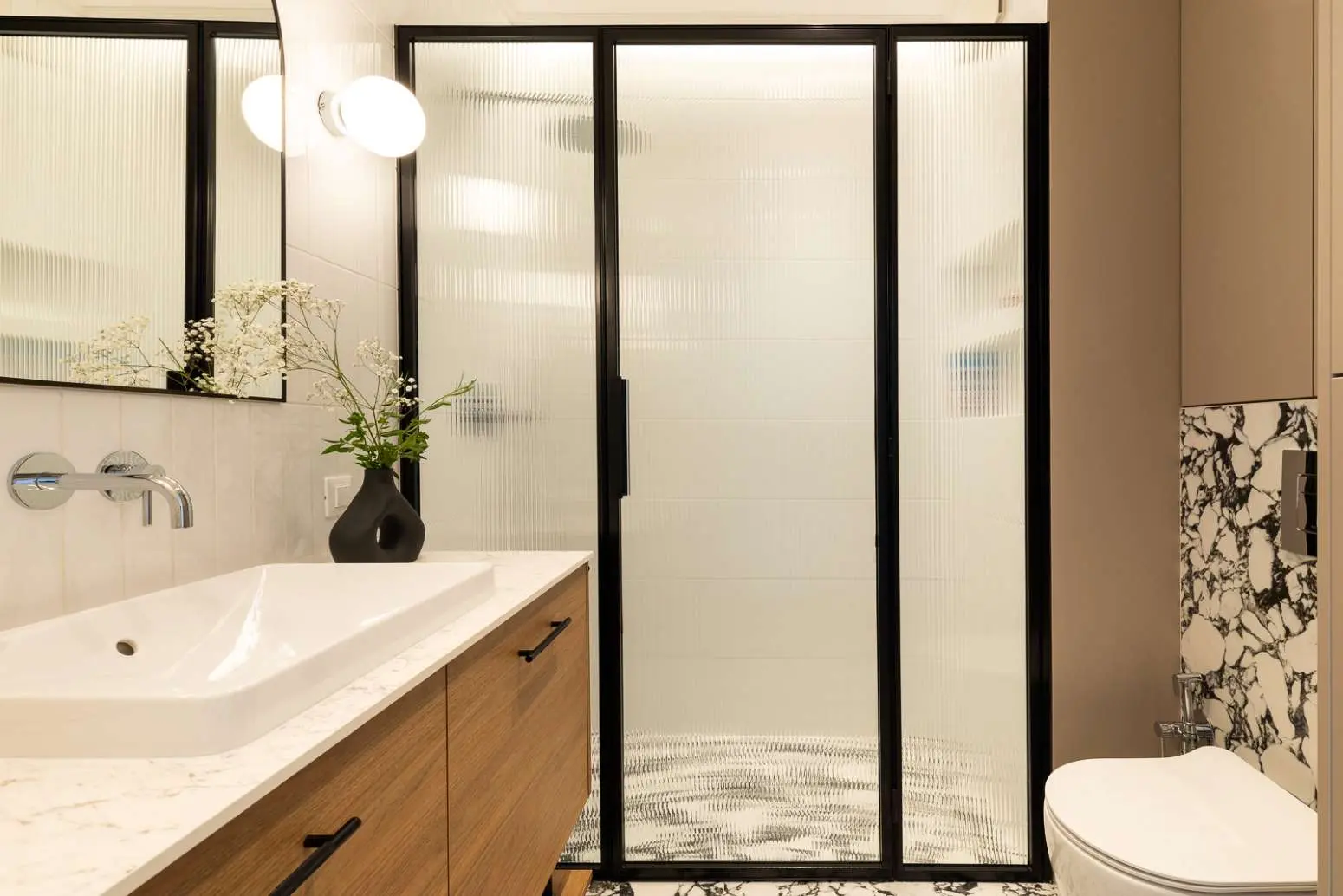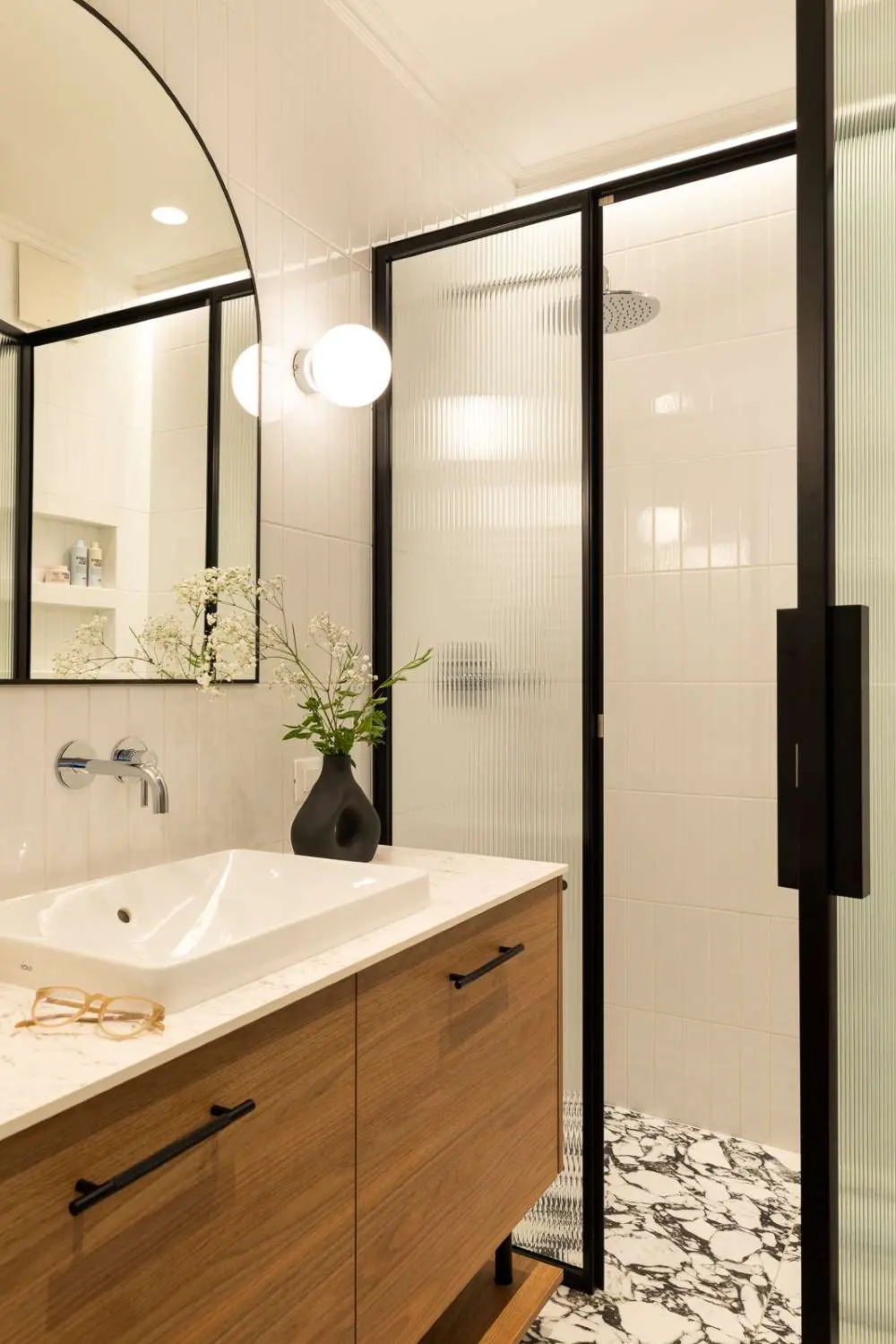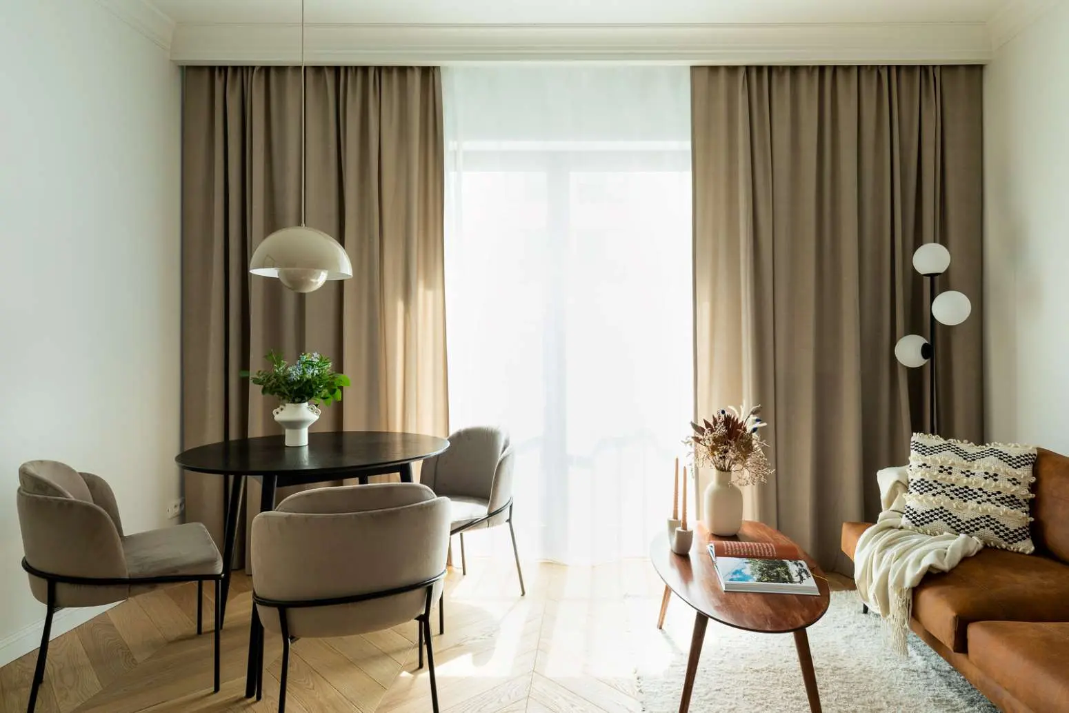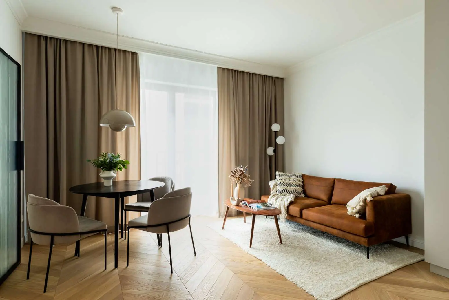 Ideą było stworzenie mieszkania na wynajem, gdzie wnętrze jest swojego rodzaju ramą dopasowującą się do stylu życia jej mieszkańców. Neutralne kolory i powracający akcent czerni idealnie współgrają ze stylistyką budynku i okolic, przenikając z zewnątrz do wnętrza mieszkania. Zmieniony został układ funkcjonalny tak, aby stworzyć dedykowaną przestrzeń biurową łączącą funkcje pokoju rozrywkowego i gościnnego. Aby powiększyć wizualnie przestrzeń, między salonem a pokojem biurowym stworzona została lekka zabudowa z ryflowanego szkła, które pojawia się jako dominujący akcent również w łazience.