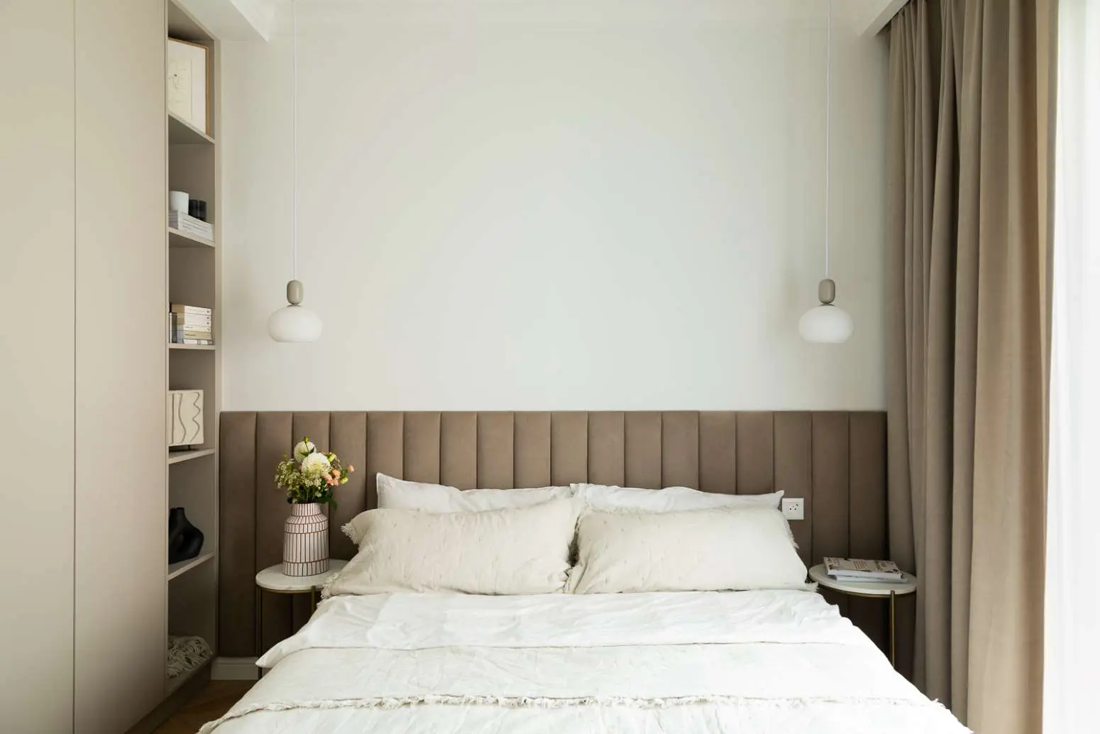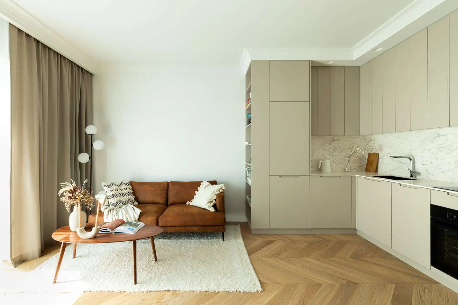 Mieszkanie zostało podzielone na dwie strefy – część prywatną z sypialnią i garderobą od strony cichego patio, oraz część dzienną z salonem, kuchnią i przestrzenią do pracy. W całym mieszkaniu pojawiają się zabudowy w dwóch odcieniach beżu, które mają pomieścić rzeczy lokatorów, ukryć wszystkie sprzęty i rzeczy codziennego użytku.