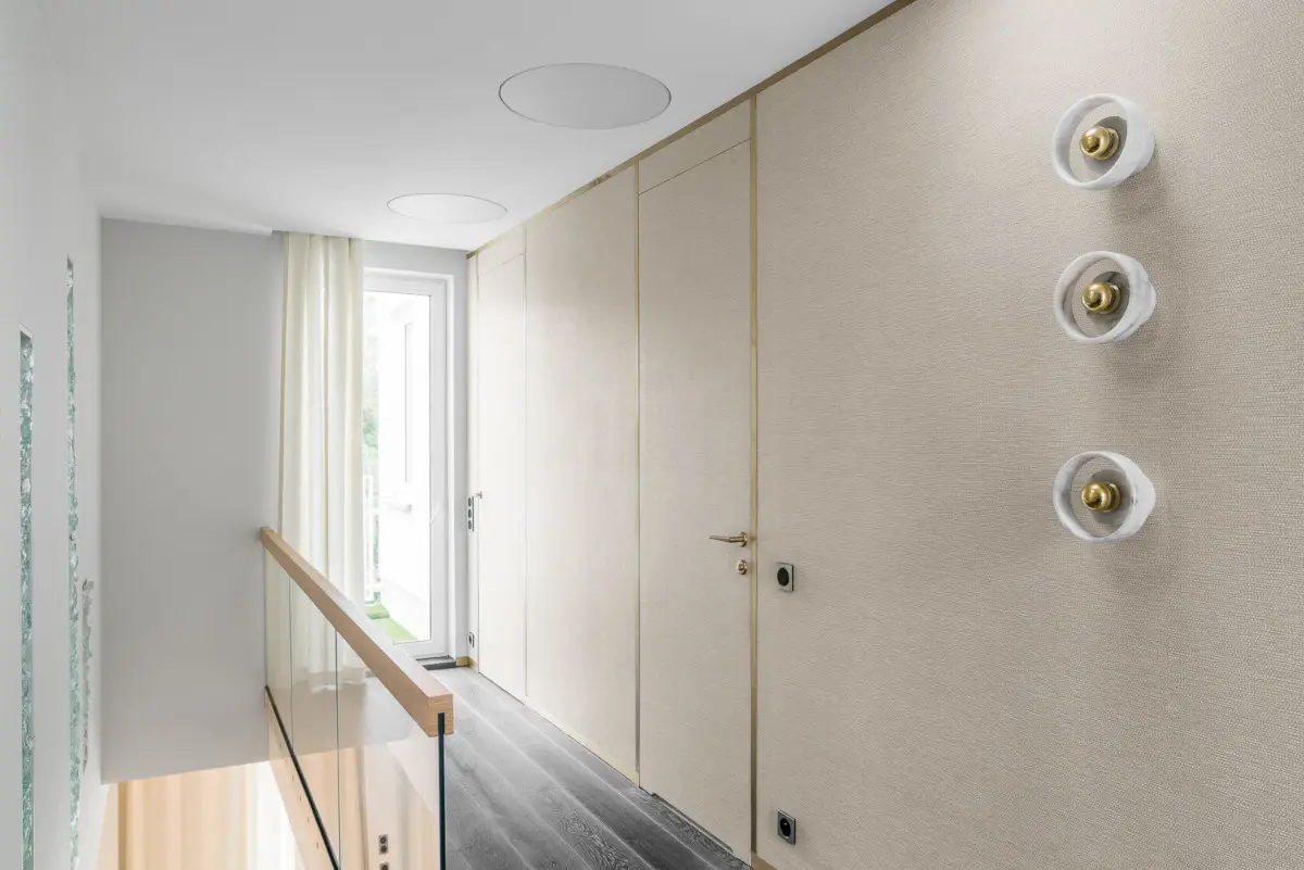 Estetyka na piętrze również przywodzi na myśl nadmorskie klimaty. Elegancka tapeta strukturą i kolorem przypomina plecione koszyki, widziane latem na plaży. Kunszt pracowni pokazują nie tylko doskonale dobrane elementy, ale też rozwiązania architektoniczne, takie jak chociażby wkomponowane w ścianę drzwi, które są praktycznie niewidoczne.