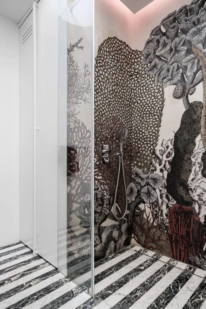 Oprócz tego, na piętrze znajdują się dwie sypialnie dla dzieci oraz dodatkowa łazienka. Przez wzgląd na to, że inwestor chciał uniknąć oczywistego rozwiązania, jakim są płytki, wybór padł na tapetę Wall & Deco, która designem również nawiązuje do nadmorskiego klimatu. Architekci zdecydowali się na wykładzinę ścienną wykonaną w systemie wet, co oznacza, że doskonale sprawdza się w miejscach, które mają bezpośrednią styczność z wodą.