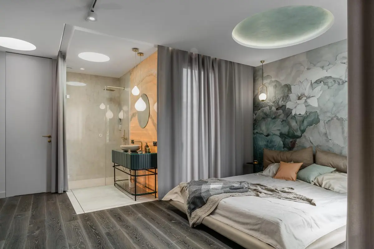 Na szczególną uwagę zasługuje strefa master, na którą składa się sypialnia, garderoba, kącik z biokominkiem oraz salon kąpielowy. Punktem, który szczególnie przykuwa uwagę jest tapeta od Wall & Deco, która zdobi ścianę za łóżkiem. Jej kolorystyka nawiązuje do morskiej palety barw i zieleni, wkradającej się do pomieszczeń przez obszerne przeszklenia.
