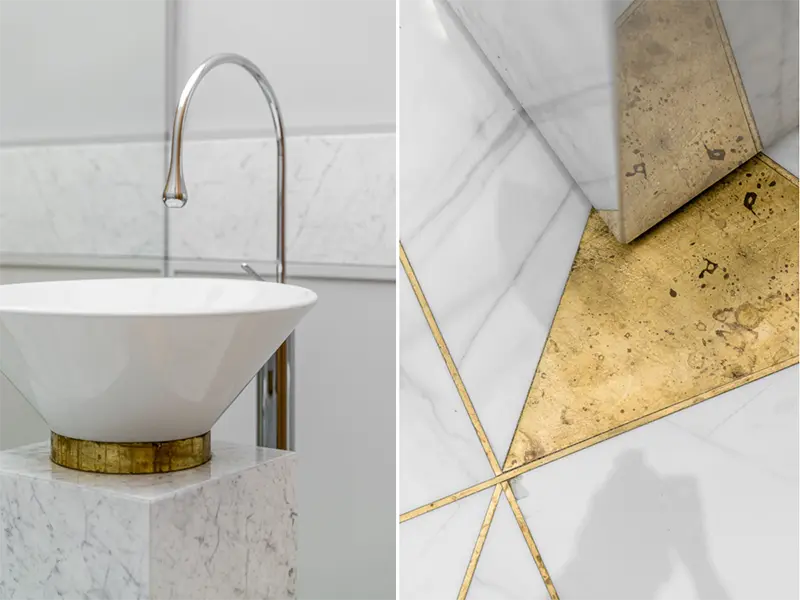 Życzeniem inwestora było wykorzystanie w projekcie złotych akcentów, które nadają wnętrzu luksusowy szlif. Połyskujące, złote elementy architektki wplotły w geometryczną posadzkę w holu i gościnnej łazience. Misternie ułożona mozaika staje się zapowiedzią niebanalnego apartamentu, w którym każdy najmniejszy detal odgrywa ogromną rolę.