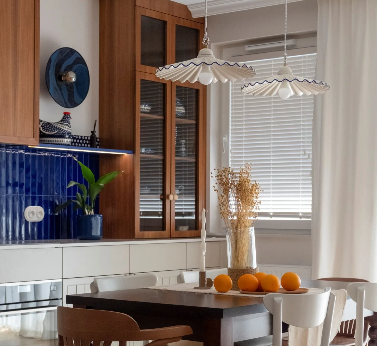 ,,Kiedy weszłyśmy na piętro, ujrzałyśmy w suficie nietypowe okrągłe świetliki, które z jednej strony skojarzyły się nam z księżycem w pełni, z drugiej zaś przywiodły na myśl estetykę postmodernizmu. Te obłe kształty stały się niespodziewanie punktem wyjścia do naszego projektu. Jednym z jego pierwszych elementów była złota wyspa kuchenna, umieszczona na planie półkoła.”