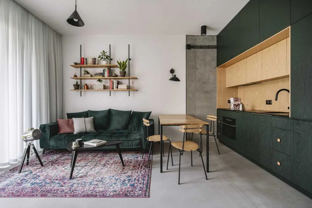 Zielony kubik nadaje tempa aranżacji, już od samego progu. Zabudowa styka się bezpośrednio ze ścianą w holu, która w całości wykończona jest lustrem. Zabieg ten potęguje wrażenie głębi, a mieszkanie wydaje się optycznie większe. Jednocześnie kubik zamyka ścianę łazienki, do której możemy się dostać za pomocą ukrytych w nim drzwi. Konstrukcja wyznacza również ramy części dziennej i mieści aneks kuchenny. Jest on mały, ale bardzo starannie zaprojektowany. Architekci zadbali, by posiadał pełny program funkcjonalnej kuchni. Blat roboczy wykonano z czarnego szczotkowanego granitu, a pas nadblatowy pokrywa lakierowany fornir w kolorze naturalnego dębu. Marzeniem inwestora było odkrycie fragmentu konstrukcyjnej ściany betonowej. Udało się to dzięki wysiłkom wykonawcy, który wydobył spod tynku naturalne piękno surowej powierzchni. Struktura harmonijnie koresponduje z zieloną zabudową oraz betonową posadzką mieszkania. Architekci złagodzili mocne, industrialne elementy wnętrza, poprzez wprowadzenie welurowej sofy, orientalnego dywanu oraz dodatków w kolorze brudnego różu.