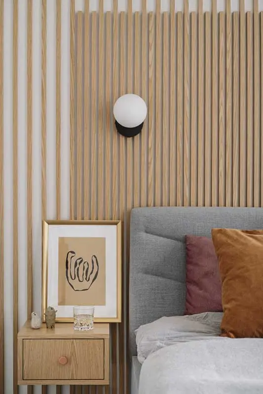 Architekci z em2 zdecydowali się na usunięcie ściany między salonem a sypialnią i zastąpienie jej dużym industrialnym przeszkleniem. Pozwoliło to na optyczne powiększenie przestrzeni i nadaniu jej otwartego charakteru, na czym zależało inwestorowi. Jednocześnie zasłona, która znajduje się tuż za szklaną ścianą, zapewnia intymność w sypialni. Miejsce do wypoczynku i snu jest jasne i przytulne. Ścianę szczytową wykończono drewnianymi lamelami, tworzącymi oryginalne zagłowię łóżka, ustawionego na ich tle. Znalazło się tu również miejsce na pojemną szafę, mieszczącą całą garderobę inwestora oraz regał na książki.