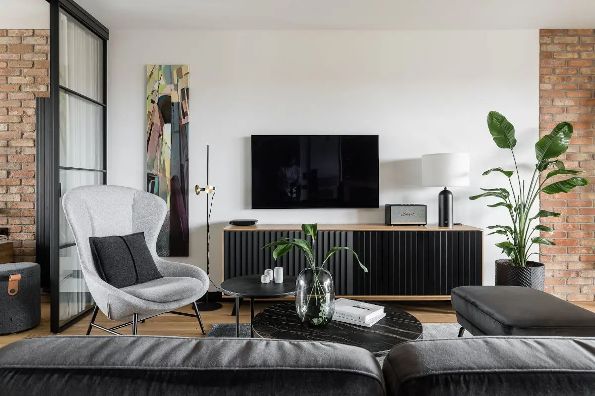 Motywem przewodnim projektu, który pojawia się w niemalże każdym pomieszczeniu jest czerwona cegła, którą uspokajają białe połacie sąsiadujących ścian. W strefie wypoczynkowej centrum stanowi welurowa sofa. Tuż obok dodatkowe miejsca do siedzenia zapewnia fotel z wysokim oparciem i pufa. Ściana telewizyjna jest minimalistyczna. Charakteru nadaje jej szafka rtv z drapowanym frontem, który kontrastuje z jeszcze bardziej dynamicznym chevronem obecnym na doniczce.