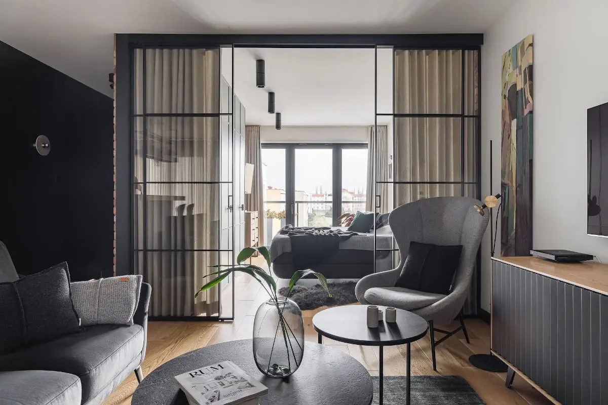 Wrażenie dużej przestrzeni, która jest największą zaletą domów wolnostojących, udało się uzyskać dzięki wyburzeniu ściany dzielącej salon i sypialnię. Zamiast nieprzepuszczalnych światła pustaków pojawiło się industrialne przeszklenie. Tym samym strefa dzienna zyskała oddech. A w razie potrzeby większej prywatności, tuż przy szklanym przepierzeniu od strony sypialni są do dyspozycji zasłony.