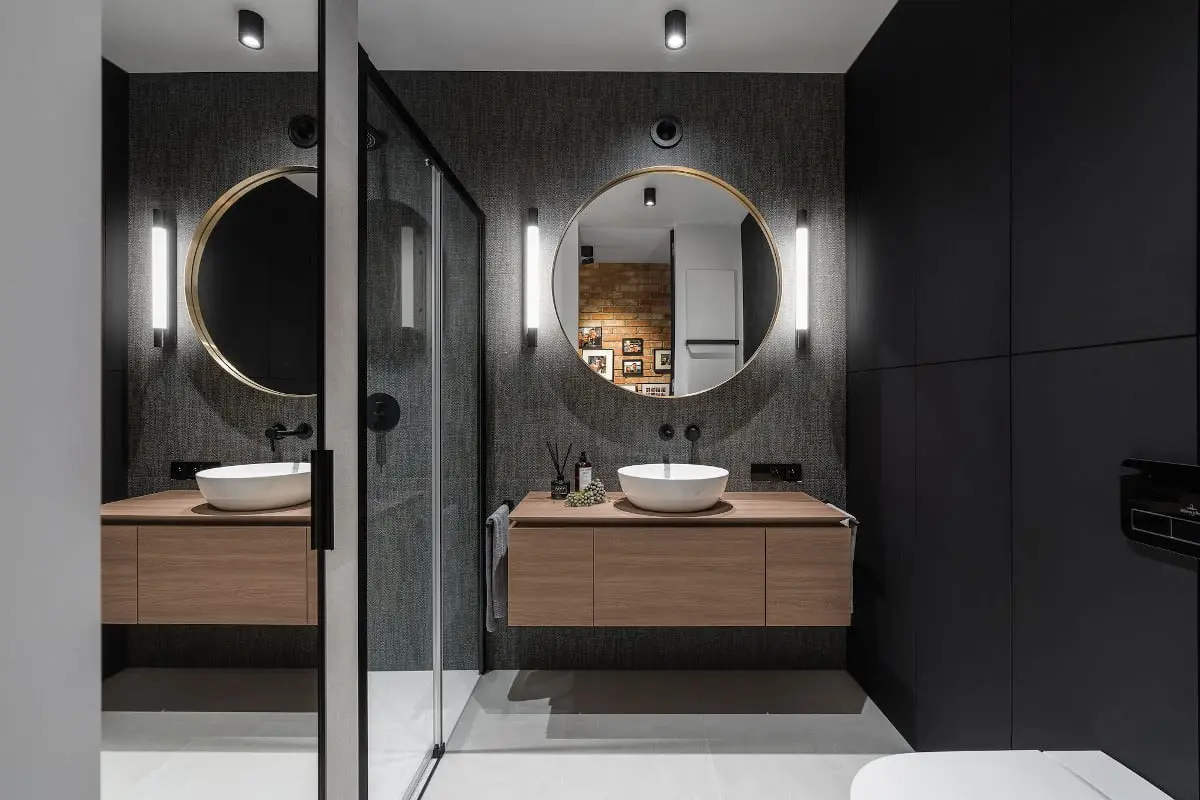 W aranżacji łazienki dominują ciemne kolory, takie jak szarość, czerń i grafit. Pożądanego ciepła nadają jej drewniane elementy a także faktura płytek ściennych. Wzór garniturowej jodełki sprawia, że płytki te wyglądają jak ciepła w odbiorze, miękka tapeta.