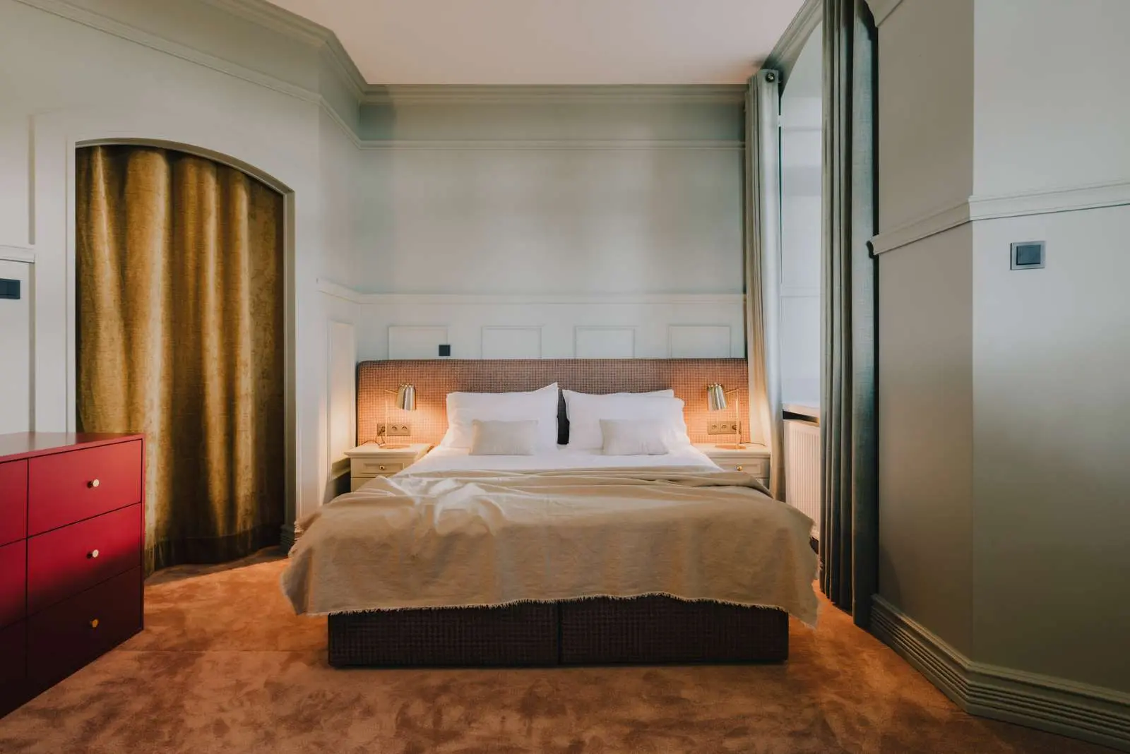 – Zależało nam, aby w pokojach stworzyć nastrojową atmosferę dla gości. Bardzo ważny był również projekt oświetlenia. Użyliśmy głównie kameralnego oświetlenia punktowego – lampki nocne z plisowanymi kloszami w różnych kolorach, retro kinkiety z odzysku połączono z minimalistycznymi lampami stojącymi, w ten sposób przełamano klasykę – opowiada Katarzyna Wisławska ze Studia WIDNO.