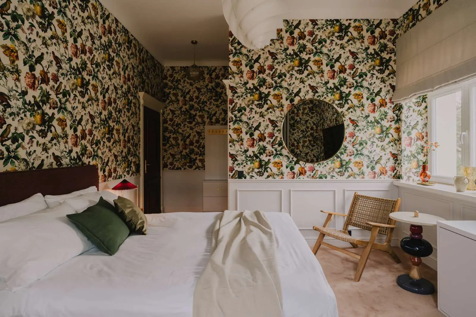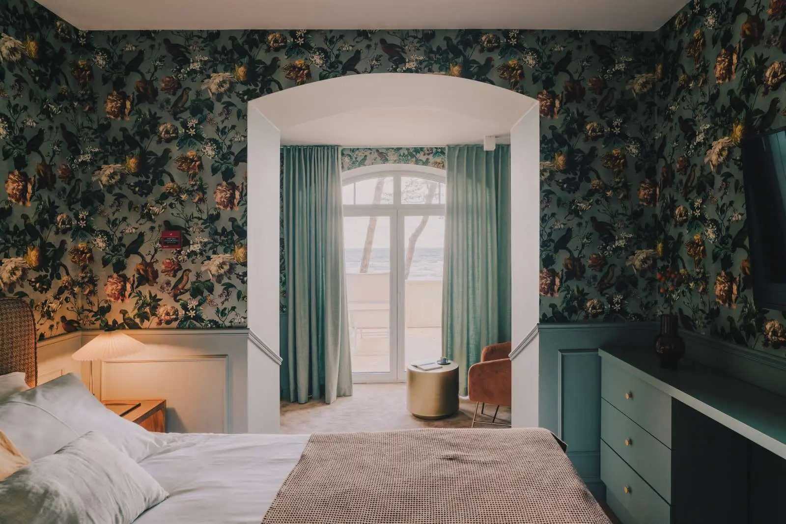 Charakterystycznym motywem przewodnim jest intensywna wzorzysta tapeta Eijffinger Museum. sztukateria w postaci nowoczesnej lamperii, welurowe i rattanowe fotele. Wnętrza zyskały nowe życie. Hotel nie przypomina sieciówek z powtarzalnym designem i zimnym wystrojem.