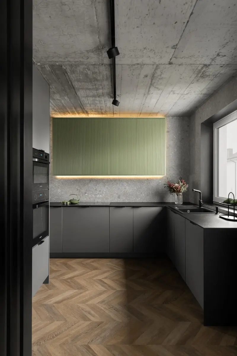 Tuż przy salonie z jadalnią zaprojektowano niewielką kuchnię z zabudową w kształcie litery ,,U”. Jej minimalistyczny wystrój definiują gładkie matowe fronty w kolorze antracytu tworzące dolne szafki oraz wysoką zabudowę, idealną do przechowywania oraz montażu sprzętów AGD. Dekoracyjnego charakteru wnętrzu nadaje kubiczna forma szafek podkreślona pionowymi ryflowaniami i podświetleniem led, które tworzy efekt lewitujących szafek.