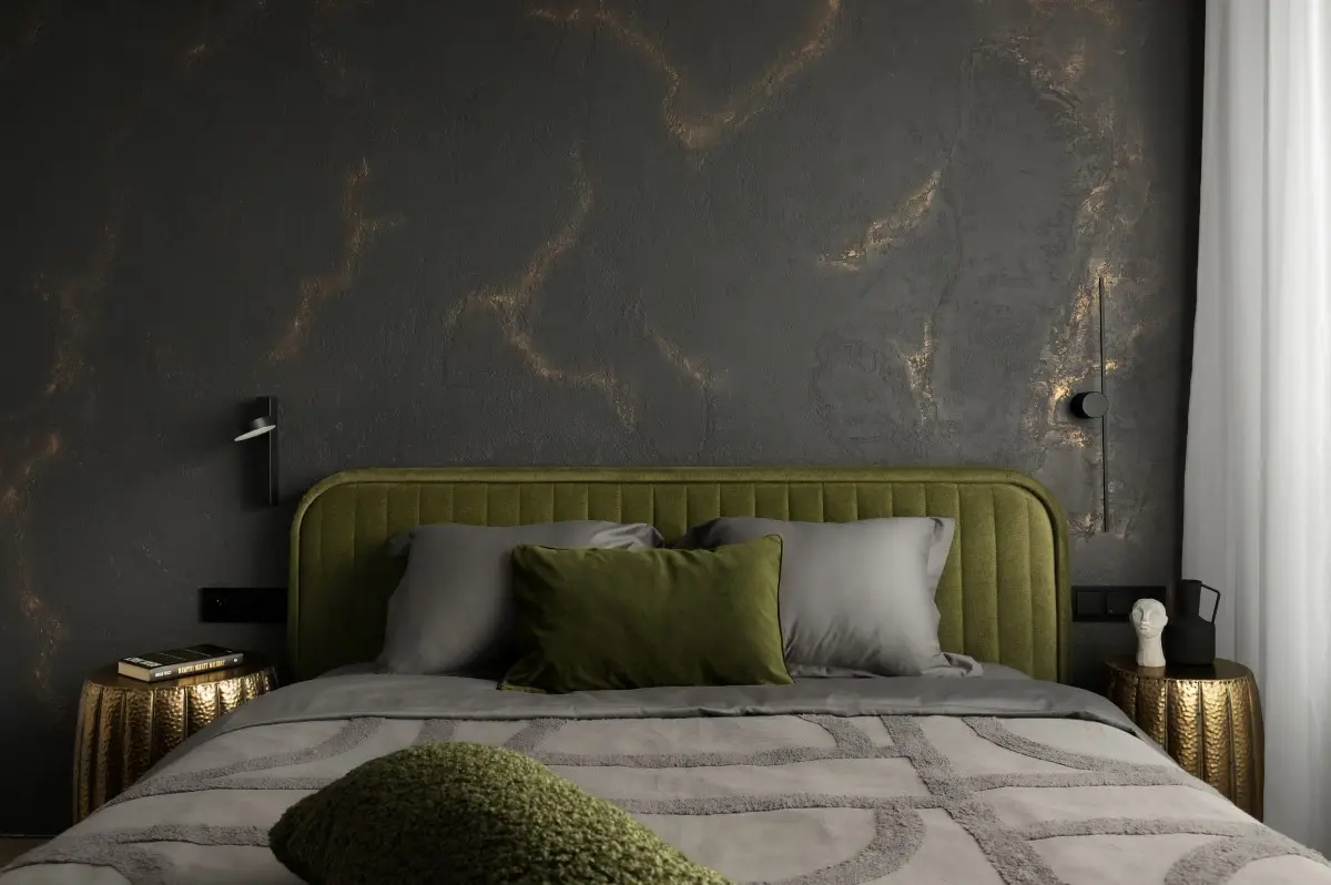 Prywatnym azylem domowników jest sypialnia, która konsekwentnie powiela estetykę całego mieszkania. Ciekawym elementem wystroju jest strukturalna ściana wyglądem przypominająca szlachetny kamień. Na jej tle pięknie prezentuje się łóżko z dekoracyjnym wezgłowiem w oliwkowym wykończeniu. Kolor ten świetnie uwypukla atmosferę wnętrza – daje poczucie bezpieczeństwa i komfortu. Nietuzinowy wygląd sypialni podkreśla niesymetryczne oświetlenie.