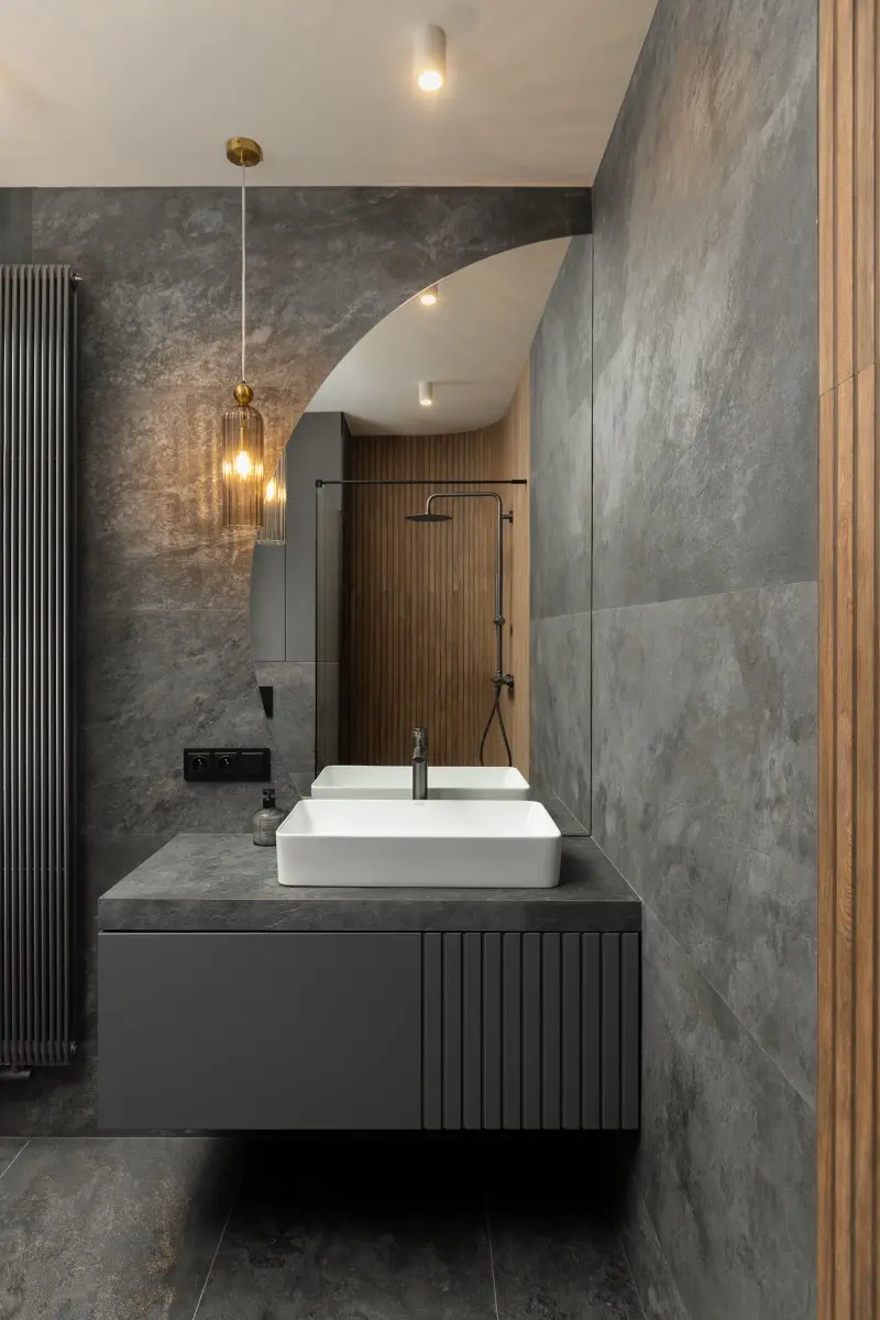 Te same wartości przyświecały przy projektowaniu głównej łazienki oraz toalety. Powielenie kolorystyki, pionowych pasów w różnych formach, motyw koła oraz gra teksturami – wszystko to sprawia, że mieszkanie jest nie tylko piękne, ale przede wszystkim spójne. Każde pomieszczenie jest dopieszczone w najmniejszym detalu, przemyślane oraz funkcjonalne, a co najważniejsze – wnętrze wyróżnia się na tle innych, zapadając w pamięć.