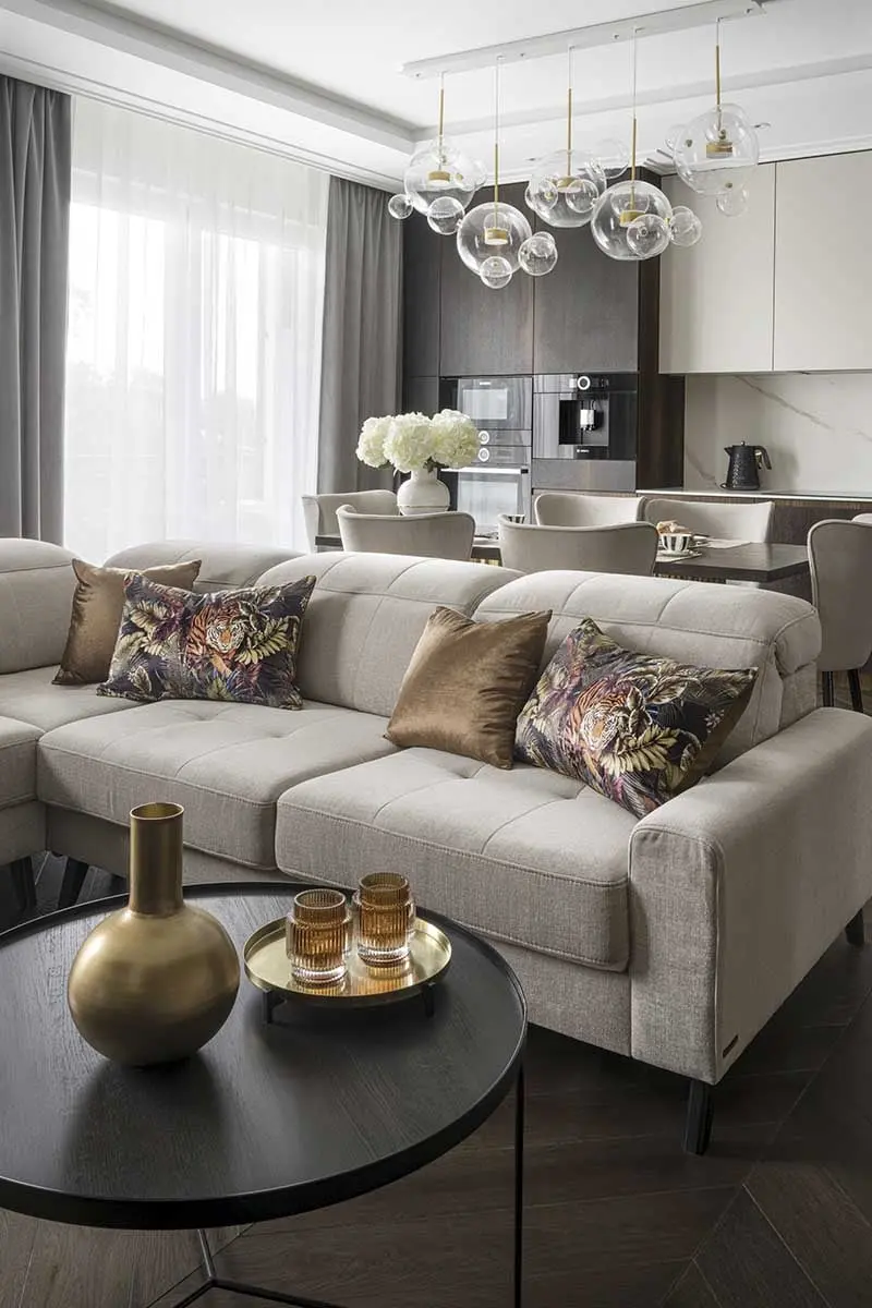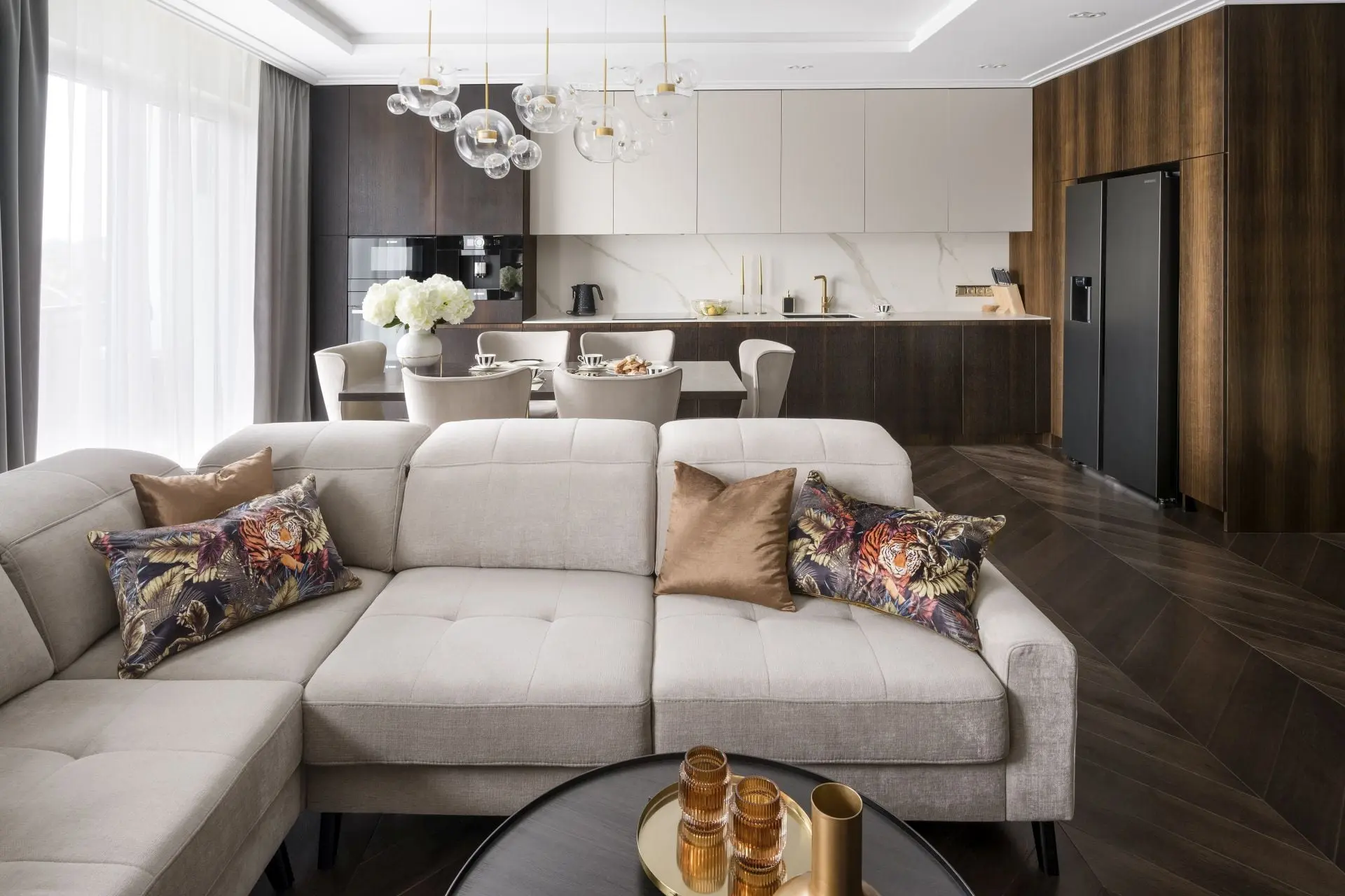 Strefę dzienną tworzy otwarta na salon kuchnia. Aneks powstał na całej długości ściany, dzięki czemu zyskano wiele miejsca do przechowywania. Ściany zdobi ciemny fornir w kolorze czarnego wędzonego dębu. Z tego samego materiału wykonano meble. Elementy te zrealizowała firma ASMEB. Podłogę w całej części dziennej pokrywa drewniany dębowy parkiet ułożony w jodełkę. Meble i tkaniny zostały utrzymane w harmonijnych barwach. Projektantka postawiła na ciepłe szarości i beże, które idealnie komponują się z ciemnym tłem. Elegancji dodają tu elementy w kolorze złota – profile jadalnianego stołu, ozdobne oprawy oświetleniowe oraz dekoracje wybrane przez właścicielkę.